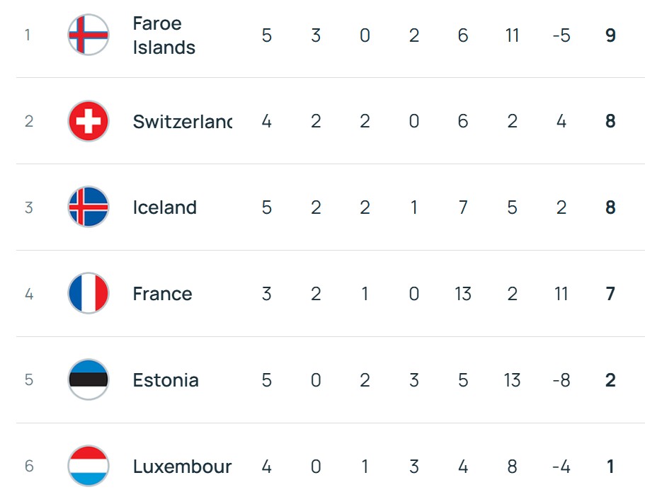 Føroyar hava 9 stig fyri 5 dystir, og Frakland hevur 7 stig fyri 3 dystir.