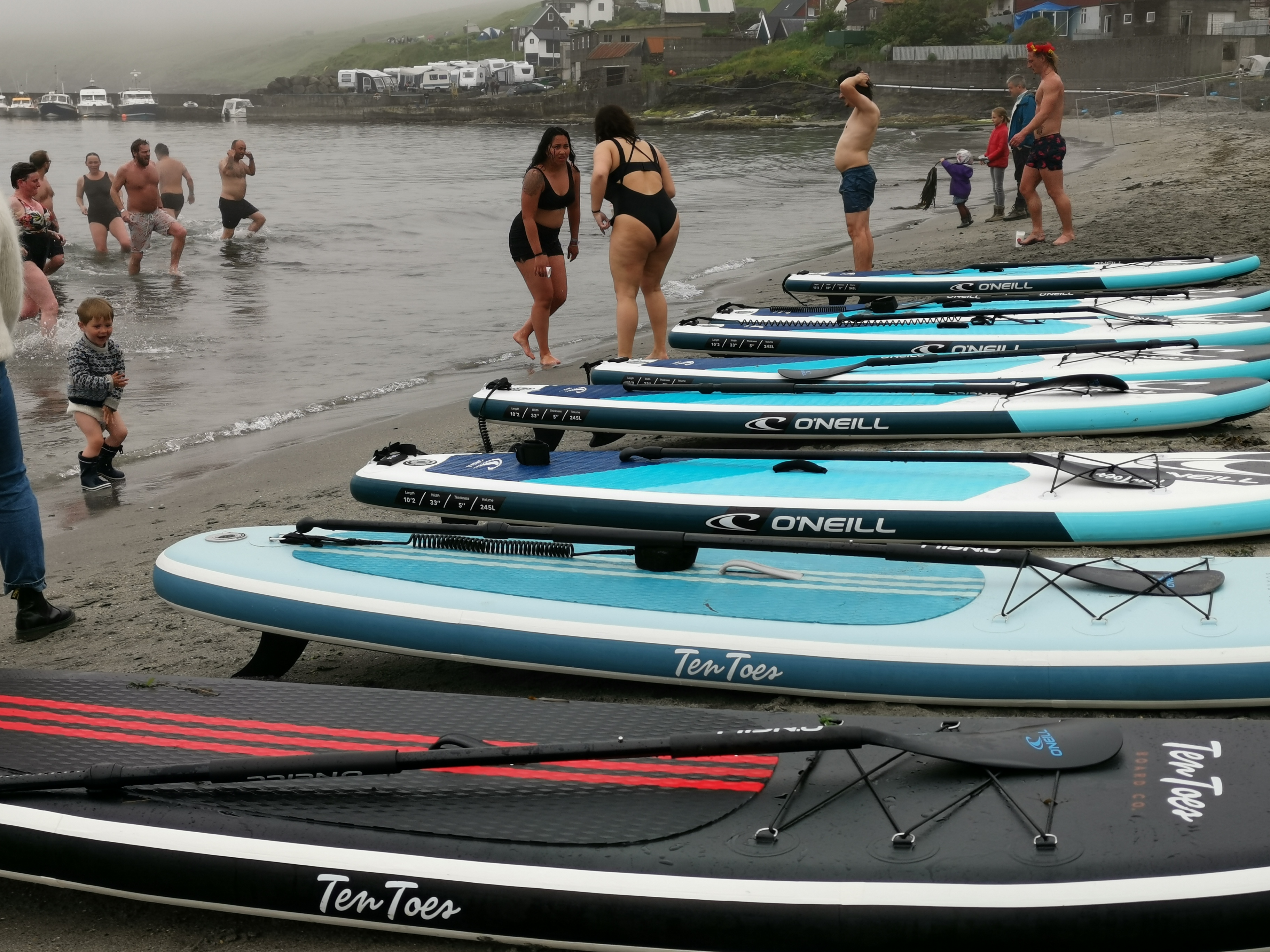 Sandurin í Syrðugøtu er fullur av fólki hendan seinnapartin, og tað hevur hann verið í allan dag. Tað plaga at vera hitapottarnir, ið lokka fólk oman á sandin, men í ár síggjast nógv fólk skupla á vatnfjølum - ella sum tað eitur á enskum paddle boarding. Hetta er eitt slag av vatnítrótti, har mann stendur á einari stórari fjøl, sum minnir um eina brimfjøl - og so rør mann við einari spakaár.