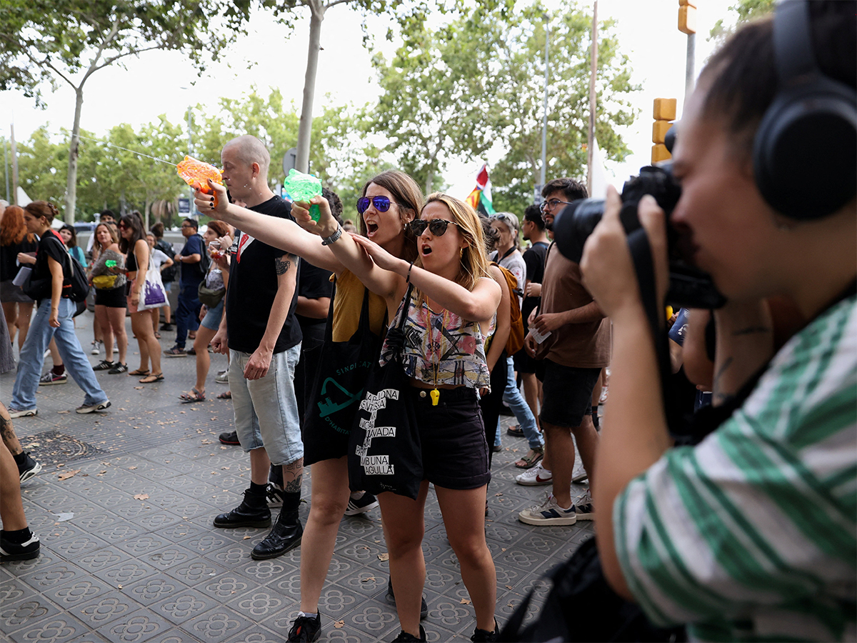 Um vikuskifti vóru mótmæli móti hópferðavinnuni í Barcelona. Summi óheppin ferðafólk fingu karm, tá ið mótmælisfólk sproytaðu vatn eftir teimum við vatnbyrsum.