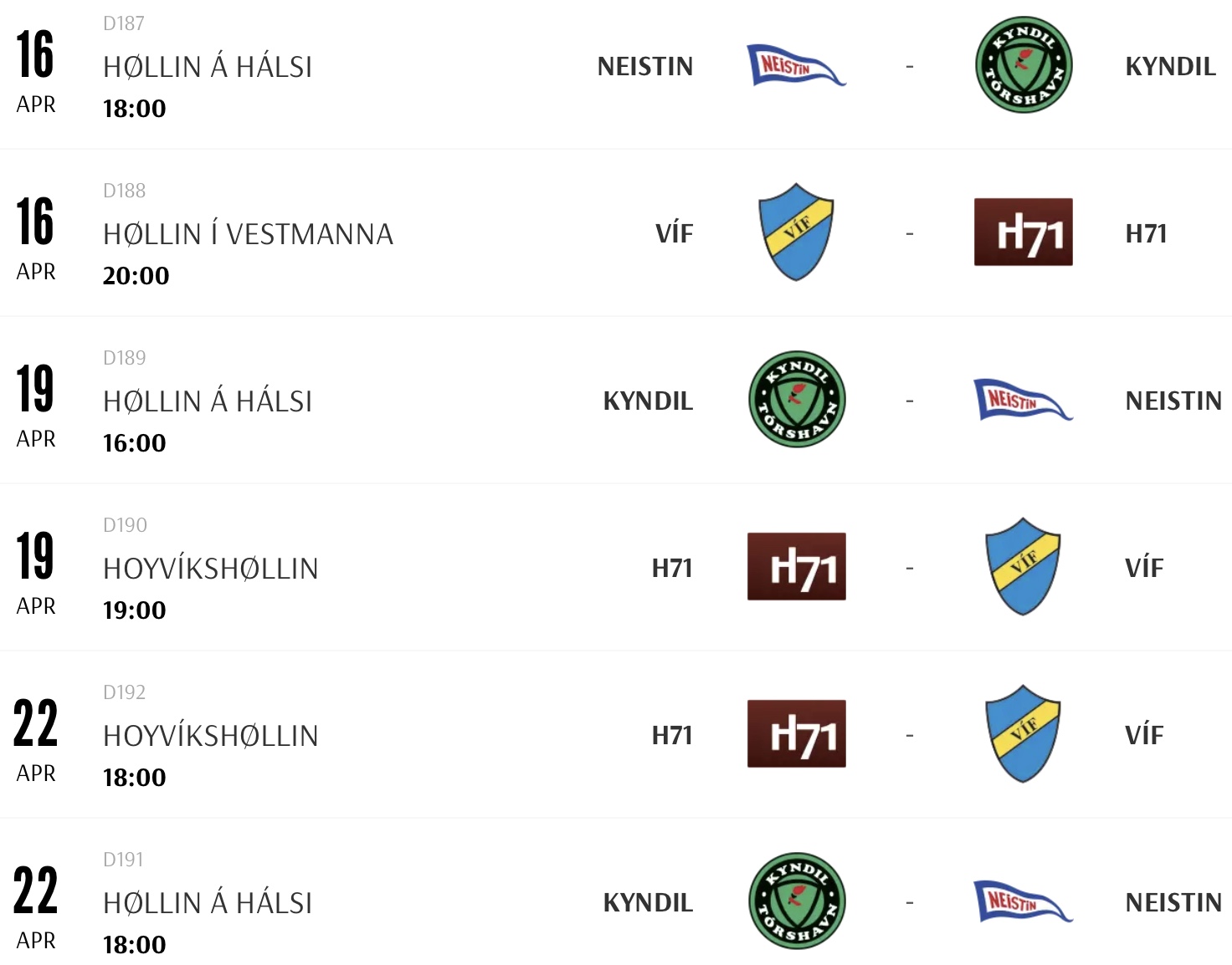Klokkan 18 spæla Neistin og Kyndil í høllini á Hálsi. Klokkan 20 spæla VÍF og H71 í høllini í Vestmanna.