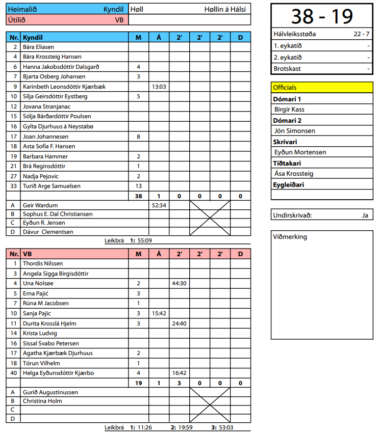 HER ber til at síggja dómaraseðilin hjá HSF frá dystinum Kyndil-VB 38-19 (22-7):