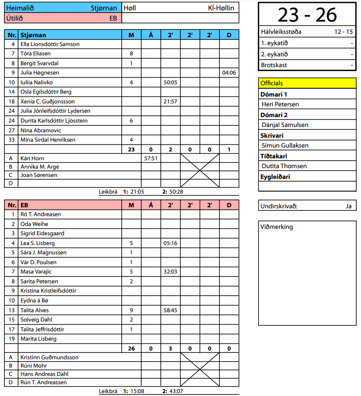 HER ber til at síggja dómaraseðilin hjá HSF frá dystinum Stjørnan-EB 23-26 (12-15):