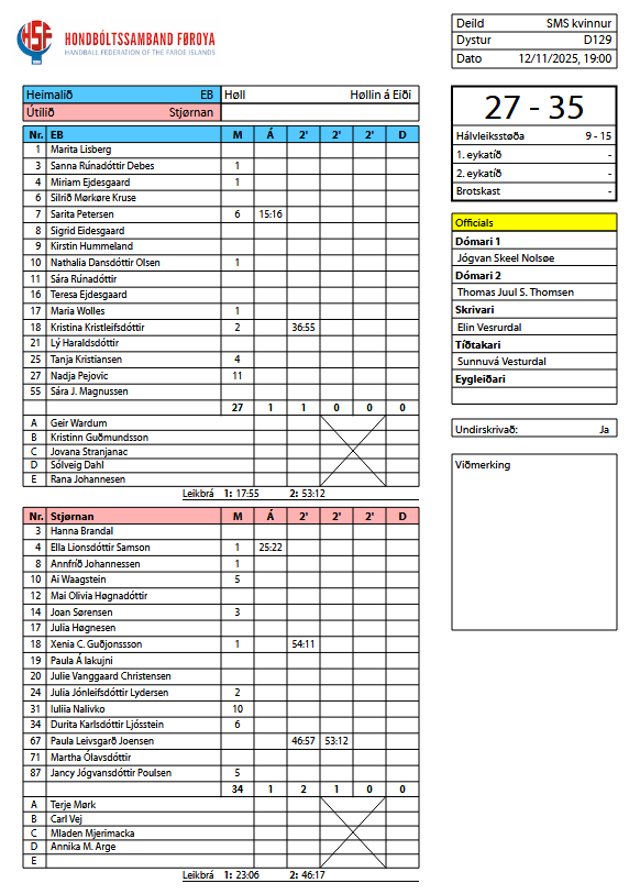 Í høllini á Eiði vann Stjørnan greiðan 35-27 sigur á EB. Í steðginum vóru klaksvíkskvinnur á odda 15-9.