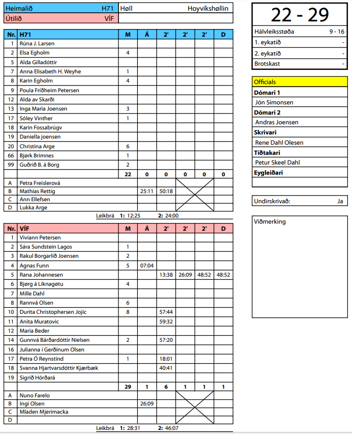 HER er dómaraseðilin frá HSF frá dystinum millum H71 og VÍF: