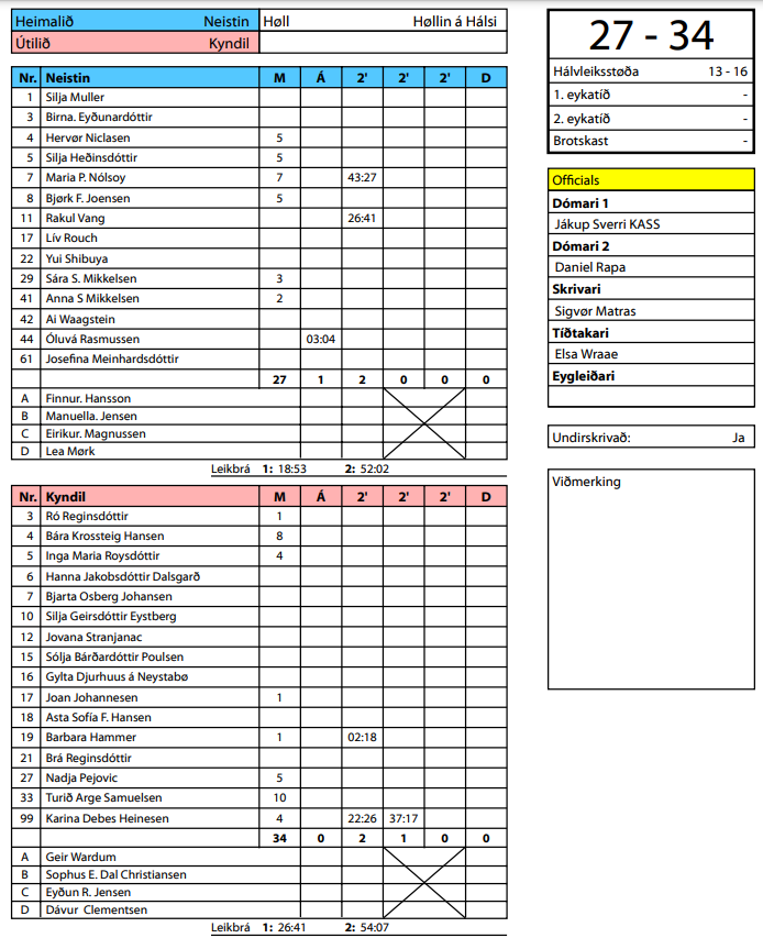 HER er dómaraseðilin frá HSF frá dystinum millum Neistan og Kyndil: