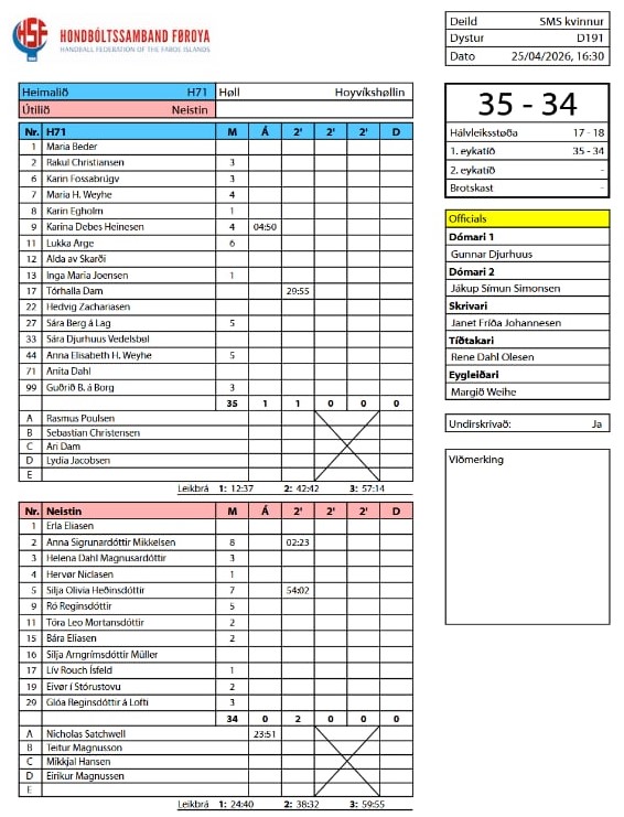 HER ber til frá HSF at síggja dómaraseðilin frá bronsudystinum í SMS-deildini: