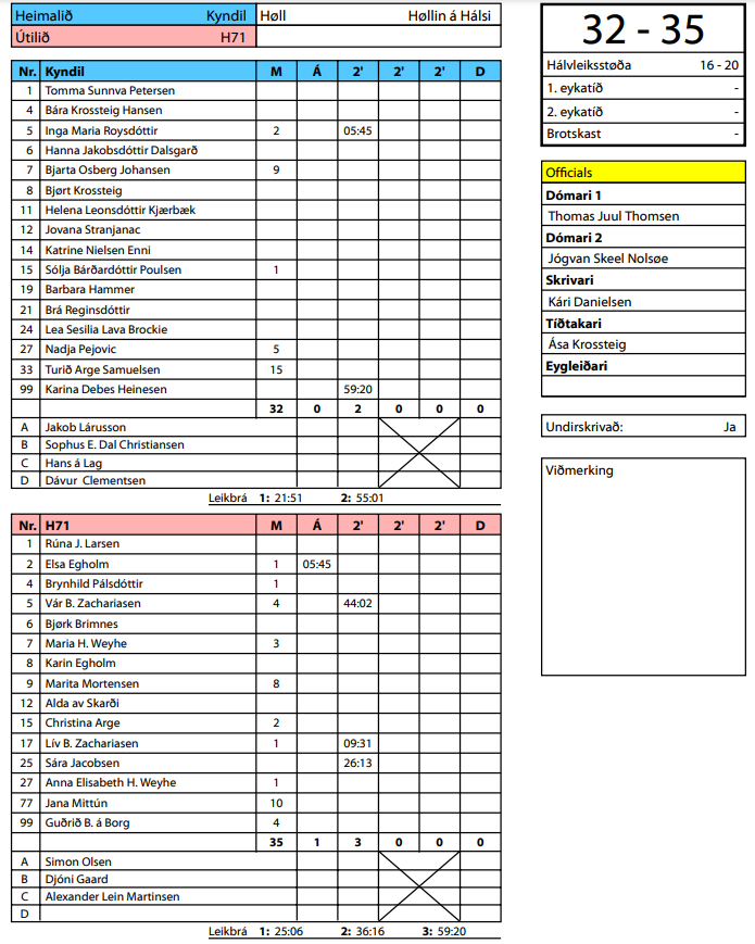 Her er dómaraseðilin frá HSF frá dystinum Kyndil-H71 32-35 (16-20):