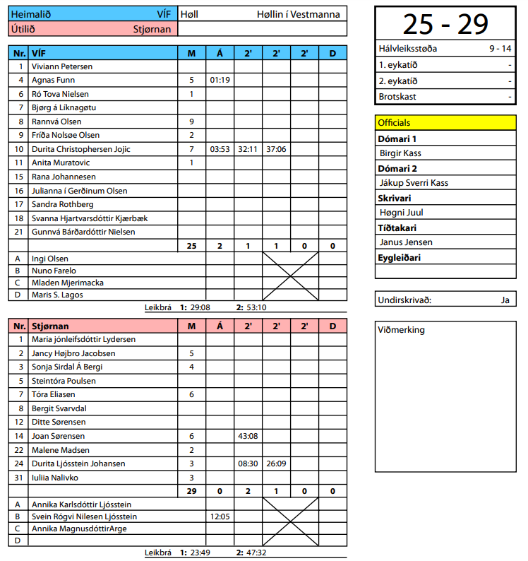 Her er dómaraseðilin frá HSF frá dystinum VÍF-Stjørnan 25-29 (9-14)
