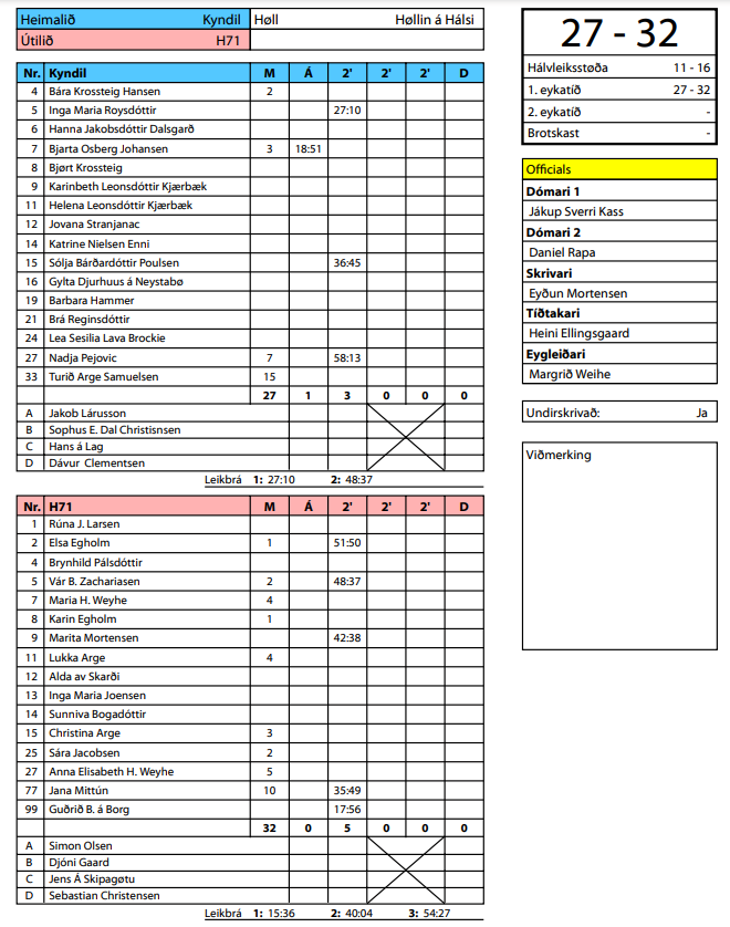H71 vann 32-27 á Kyndli í høllini á Hálsi. Í steðginum var H71 á odda 16-11. Tá sjey minuttir vóru farnir av seinna hálvleiki var H71 á odda 22-14.