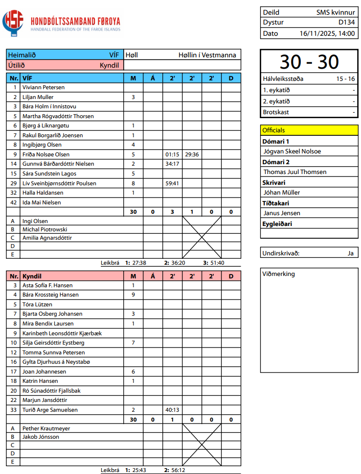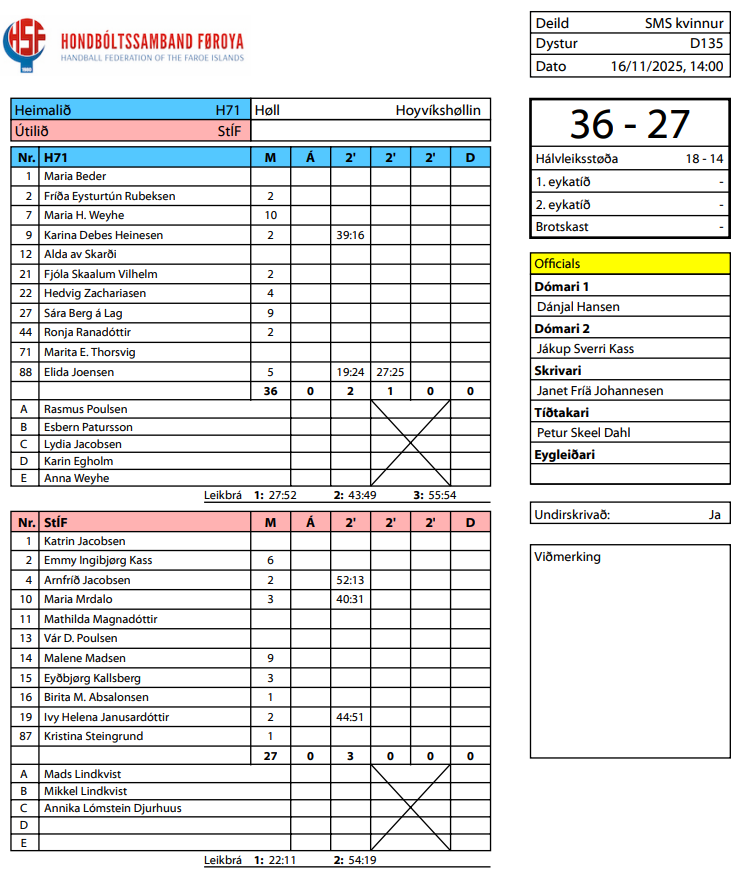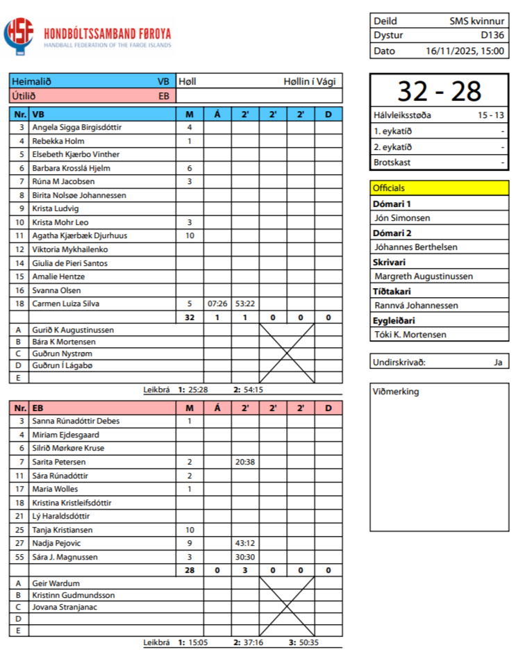HER ber til frá HSF at síggja dómaraseðlarnar frá dagsins dystum í SMS-deildini: