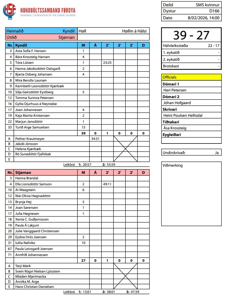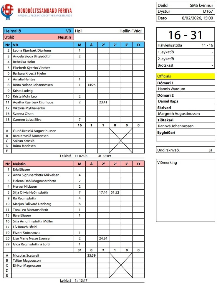 HER ber til frá HSF at síggja dómaraseðlarnar frá dagsins dystum, umframt støðuna: