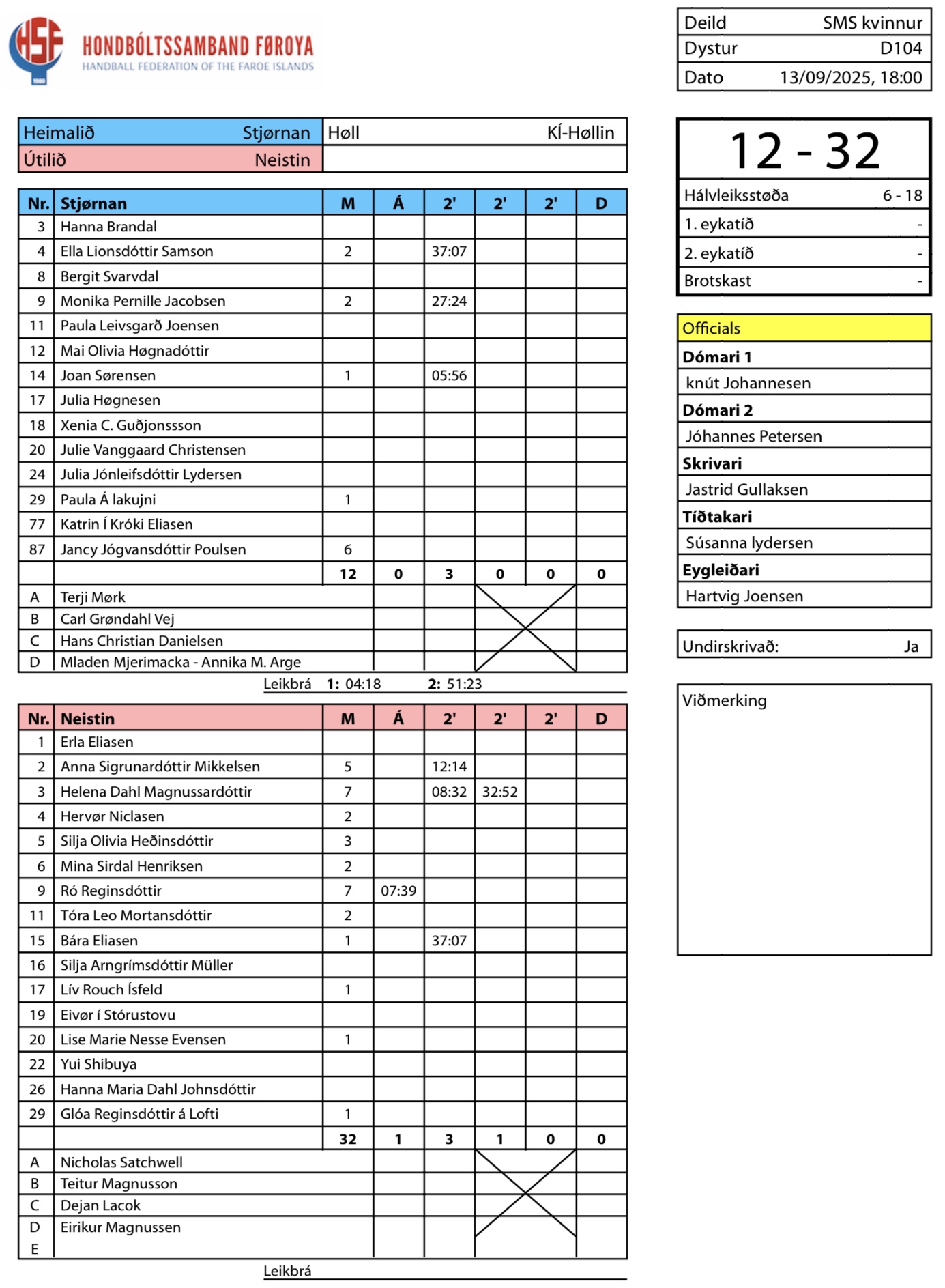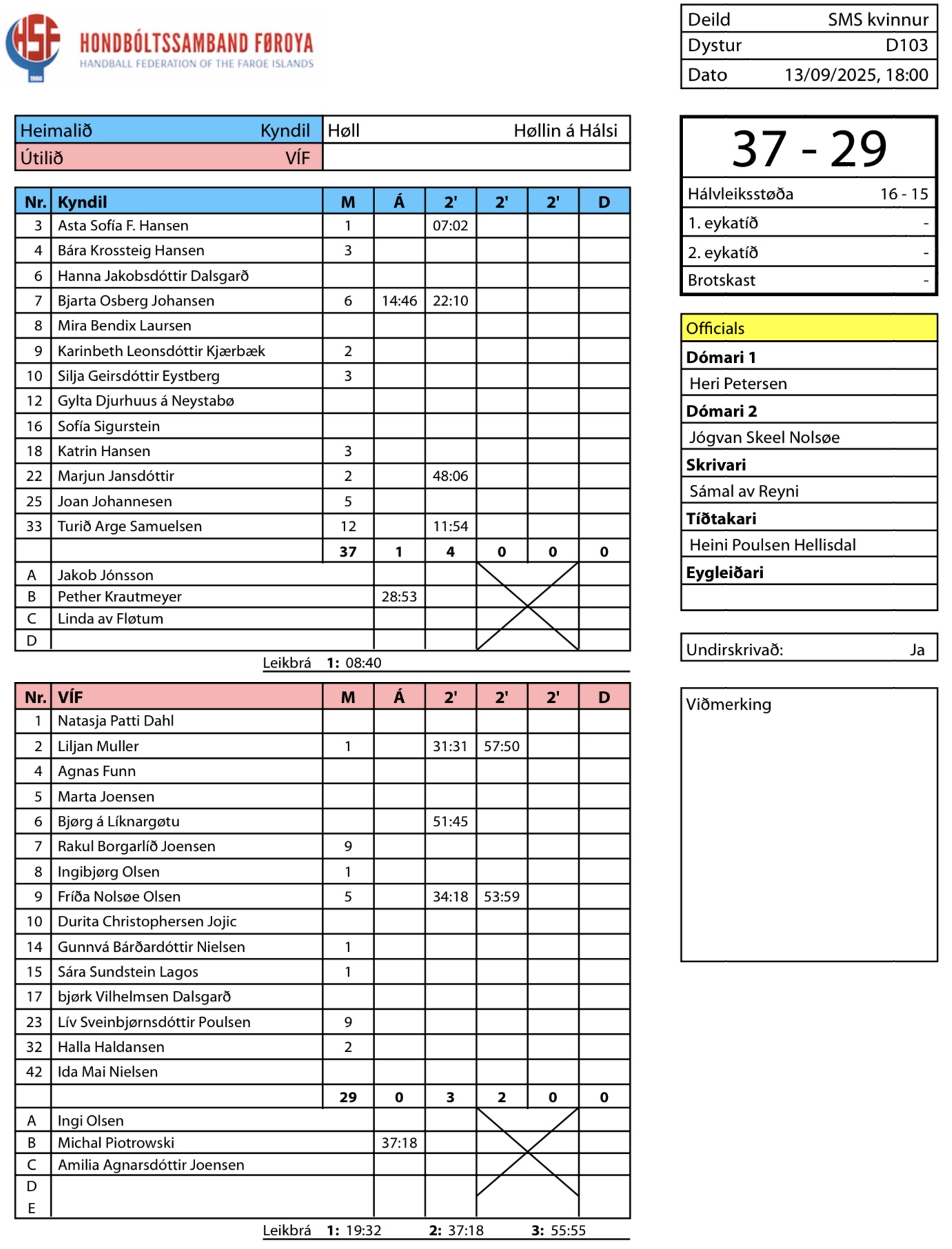 HER ber til frá HSF at síggja báðar dómaraseðlarnar frá dystunum, ið vóru leiktir í kvøld: