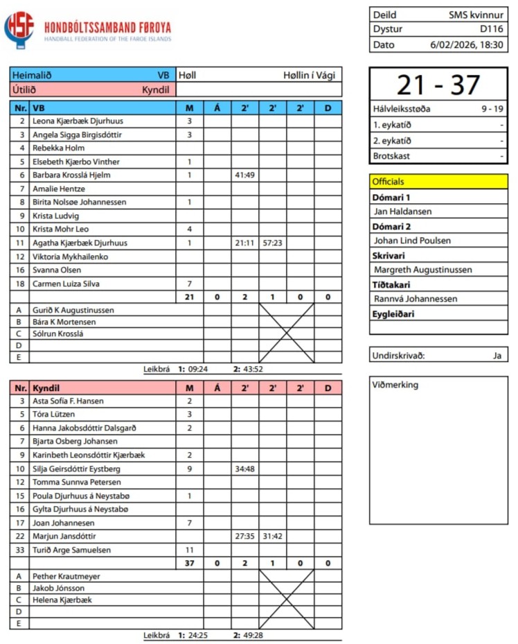 HER ber til frá HSF at síggja dómaraseðilin frá dystinum millum VB og Kyndil, umframt støðuna í deildini: