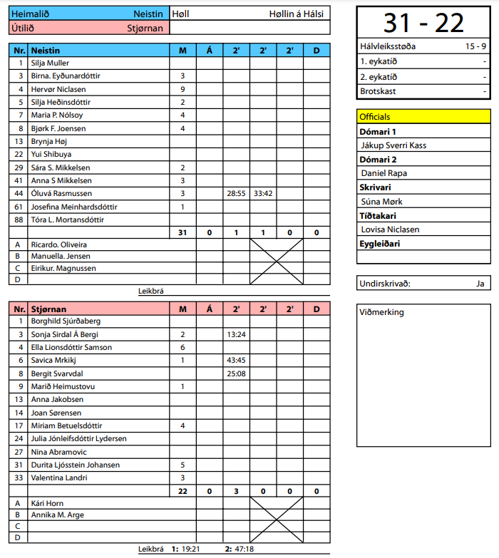 Neistin endurvann oddasessin í SMS-deildini við einum greiður 31-22 sigri á Stjørnuni. Í steðginum var Neistin á odda 15-9.