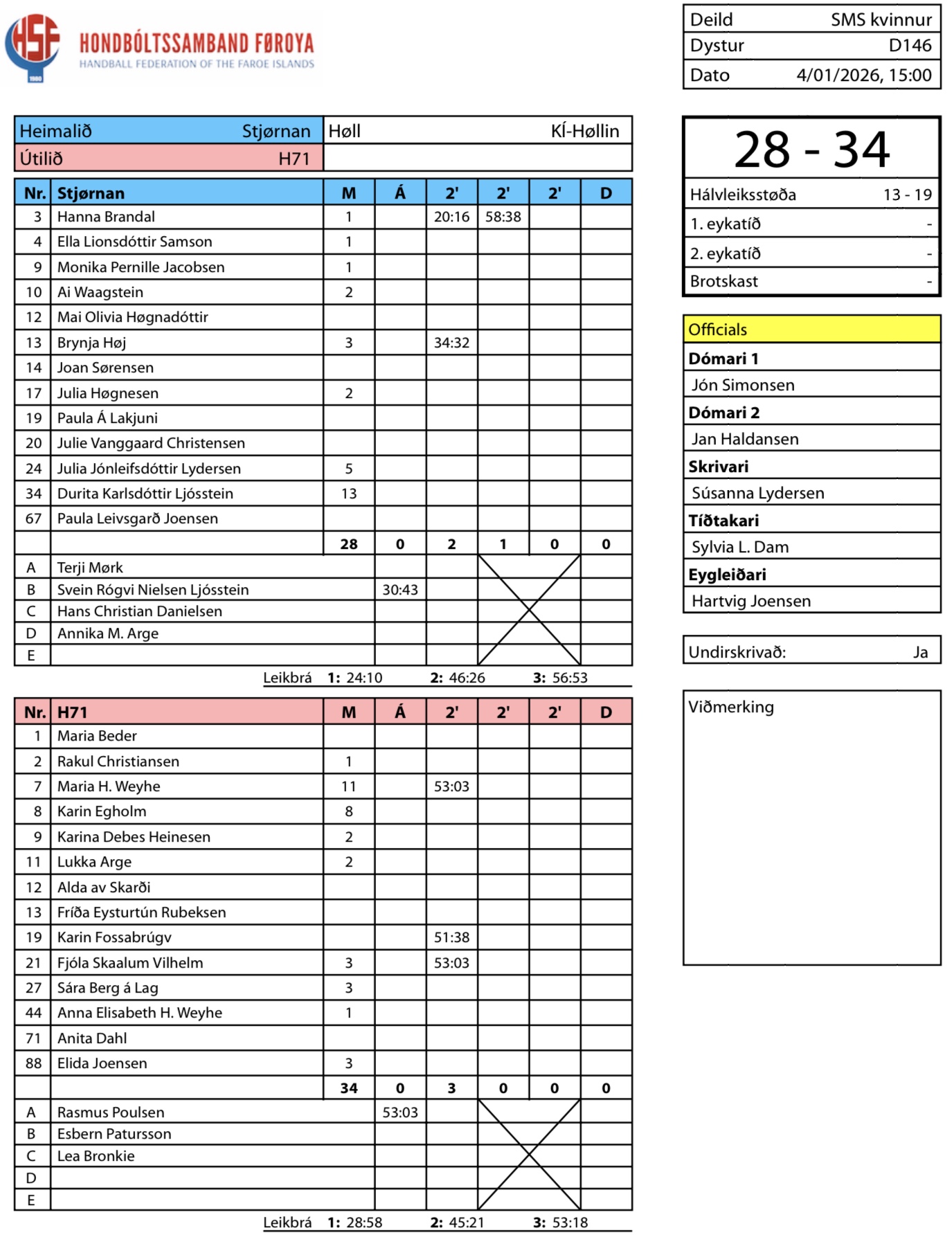 Í KÍ-høllini vann H71 34-28 á Stjørnuni. Í steðginum var H71 eisini frammanfyri við seks málum. Tá var støðan 19-13.