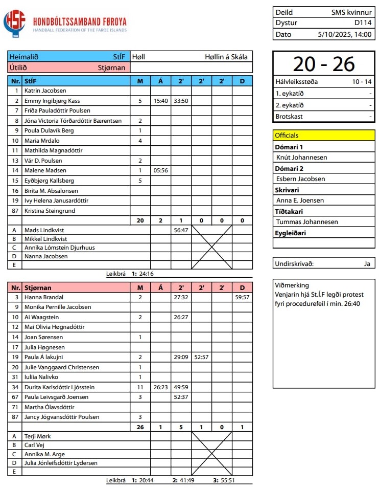 Í høllini á Skála vann Stjørnan 26-20 á StÍF. Klaksvíkskvinnur vóru á odda 14-10 í steðginum.