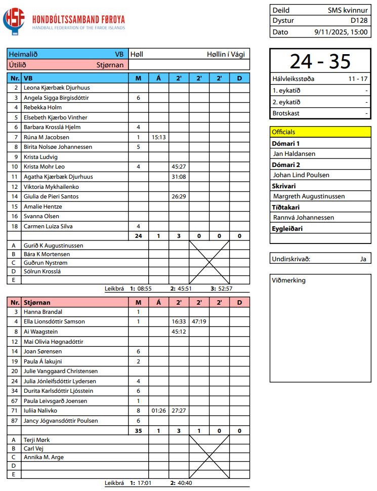 HER ber til frá HSF at síggja dómaraseðilin frá dystinum millum VB og Stjørnuna:
