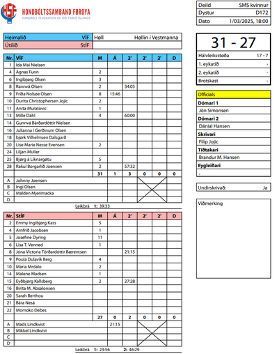 HER ber til frá HSF at síggja dómaraseðlarnir frá dystunum í Vestmanna og í Klaksvík og støðuna: