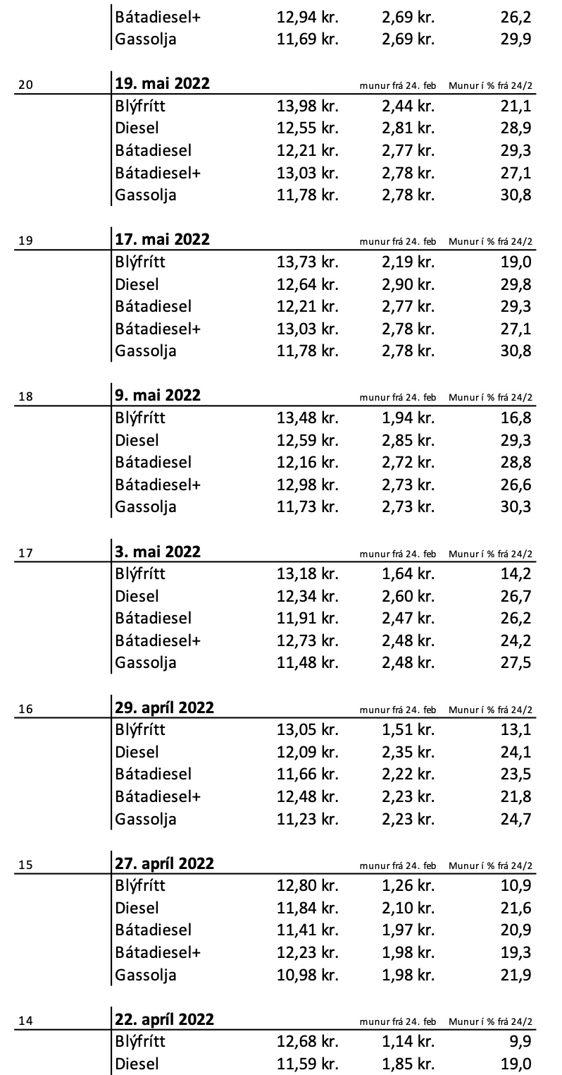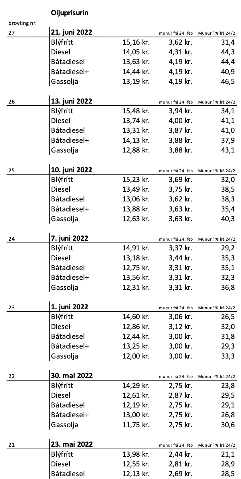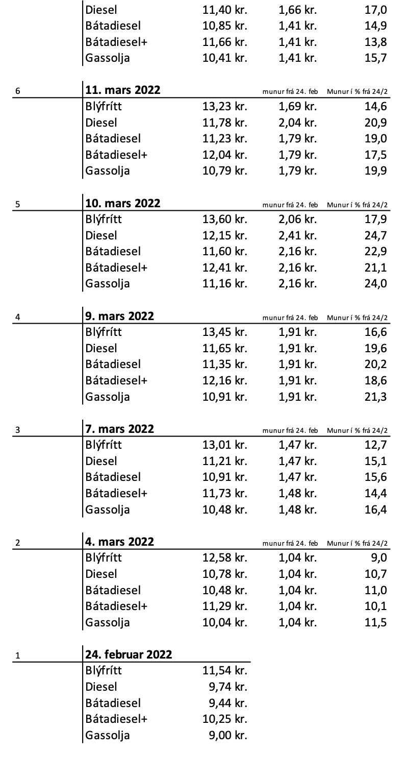Soleiðis hevur prísurin á olju og bensini verið í Føroyum síðani 24. februar í ár: