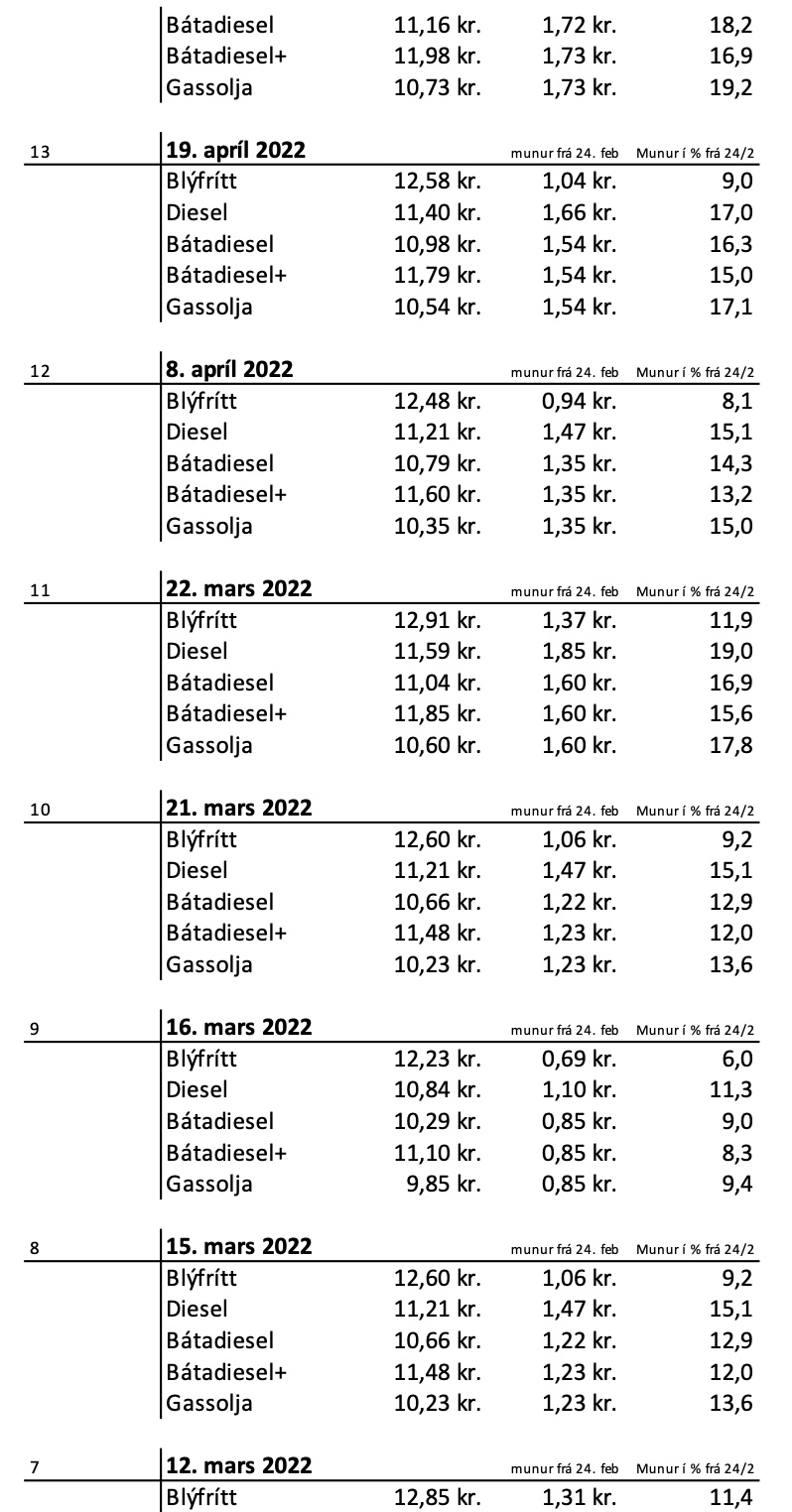 Ein litur av diesel dýrkaði fyri løtu síðani 31 oyru. Ein litur av bátadiesel somuleiðis 31 oyru og ein litur av gassolju – húsarhaldsolju, hækkaði eisini 31 oyru.