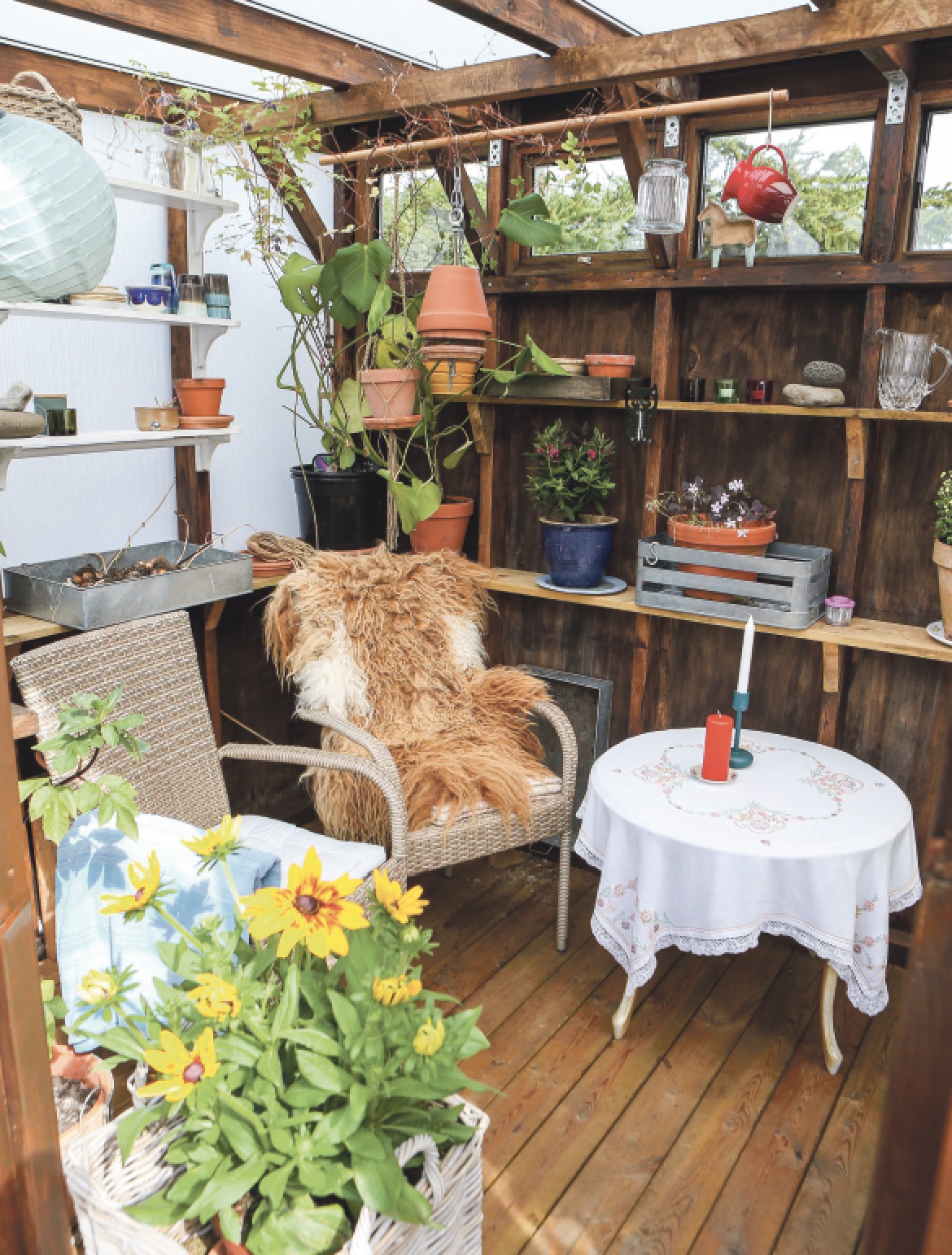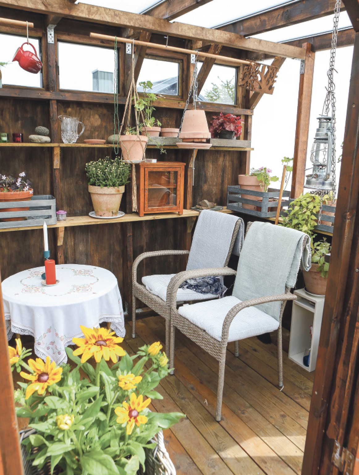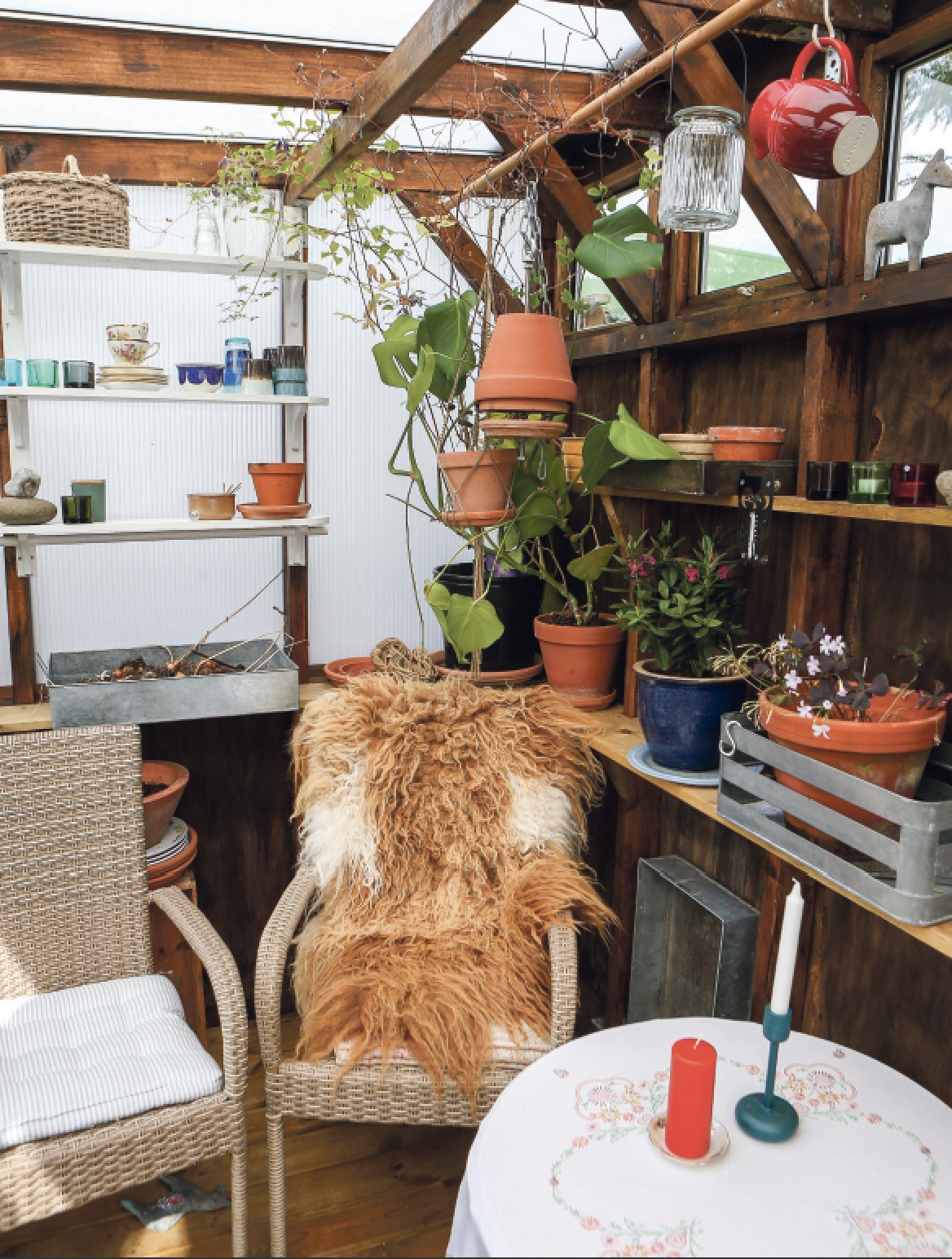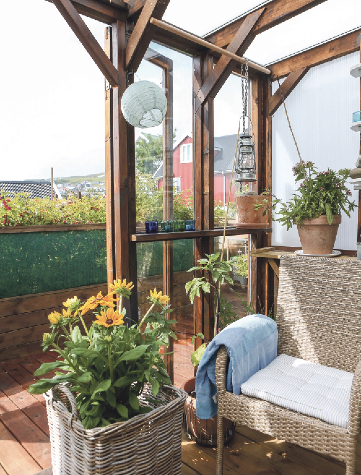 Vakstrarhúsið á terassuni hevur Michael teknað og smíðað, og Sólrún hevur málað tað. Nakað av tilfarinum er endurnýtslutilfar, sum Michael hevur útvegað sær. Skrokkurin er styrktur við atliti til vestanvindin, sum er ógvisligur um veturin, so tað er bóltað fast, og tað rørir seg ikki, sjálvt um tað er hvassur vindur.