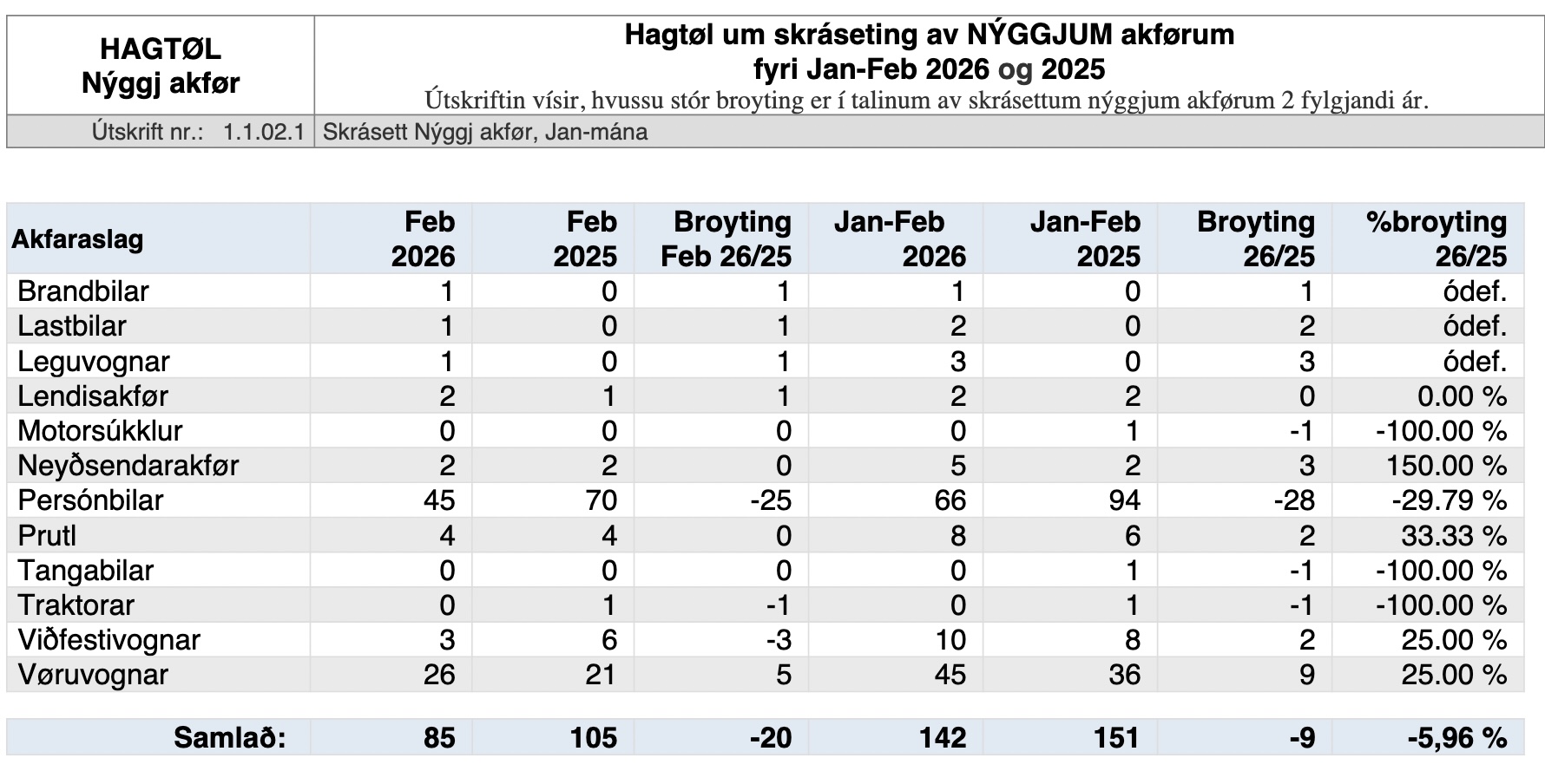 Tilsamans er skrásetingin av øllum akførum í Føroyum ársins fyrstu tveir mánaðirnar farin úr 151 niður í 142. Ein afturgongd upp á 9 akfør svarandi til 5,96 prosent.