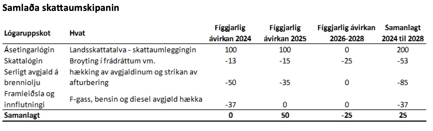 Talvan omanfyri lýsir ymisku lutirnar í skattaumskipanini 2024-28.Umframt inntøkur frá lógaruppskotunum í skattaumskipanini, koma 10 mió. kr. frá avgjøldum á f-gass[BB1] [BB2] [BM3] [BB4] . Sí uppskot til løgtingslóg um broyting í løgtingslóg um avgjald á framleiðslu og innflutningi (Avgjøld á f-gass og ávísar rættingar í vørunumrum og øðrum).
