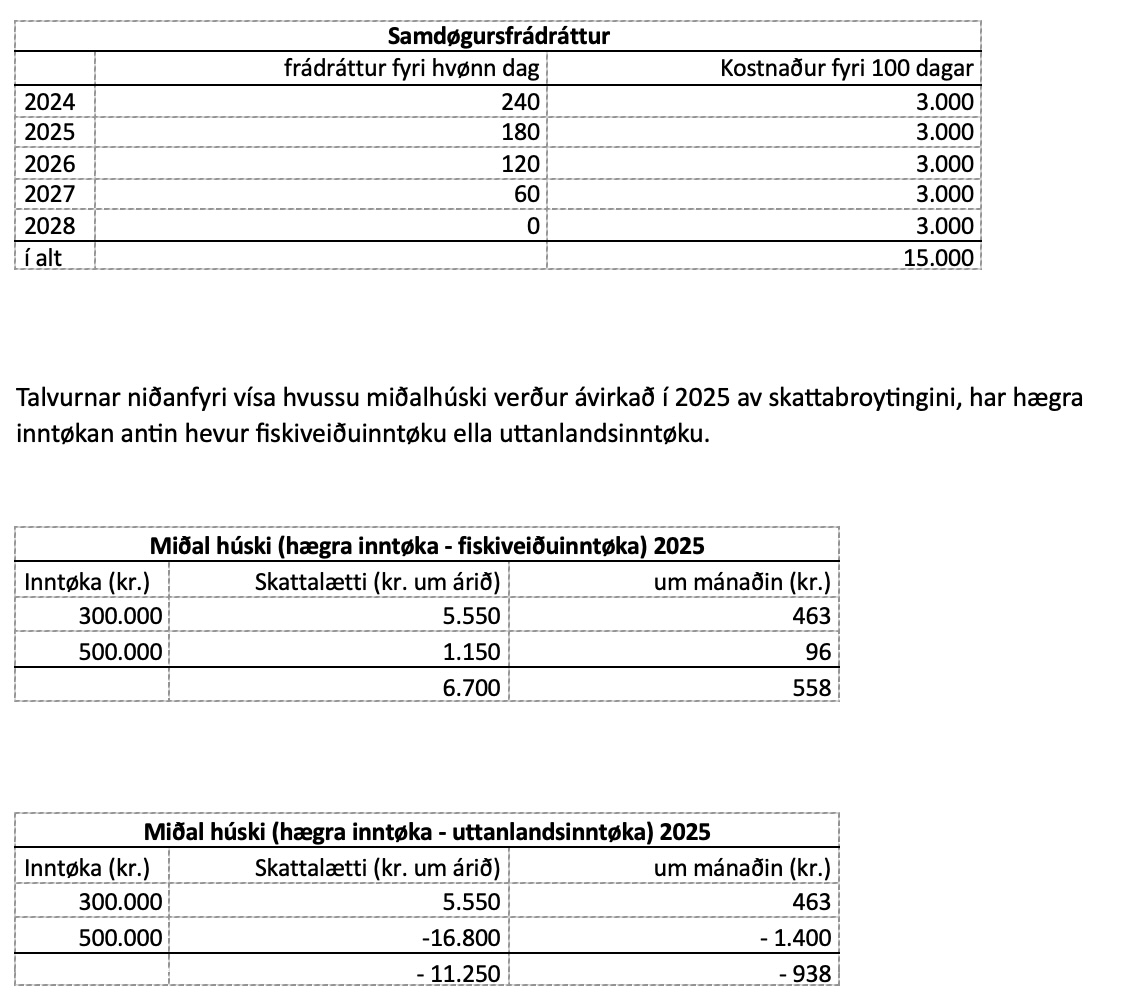 - Uppskot til løgtingslóg um broyting í løgtingslóg um landsskatt og kommunuskatt (Skattalógin) (Skattaumskipan 2024 og 2025, stigvís minking av fiskimannafrádráttinum og avtøka av samdøgursfrádráttinum og uttanlandsfrádráttinum)