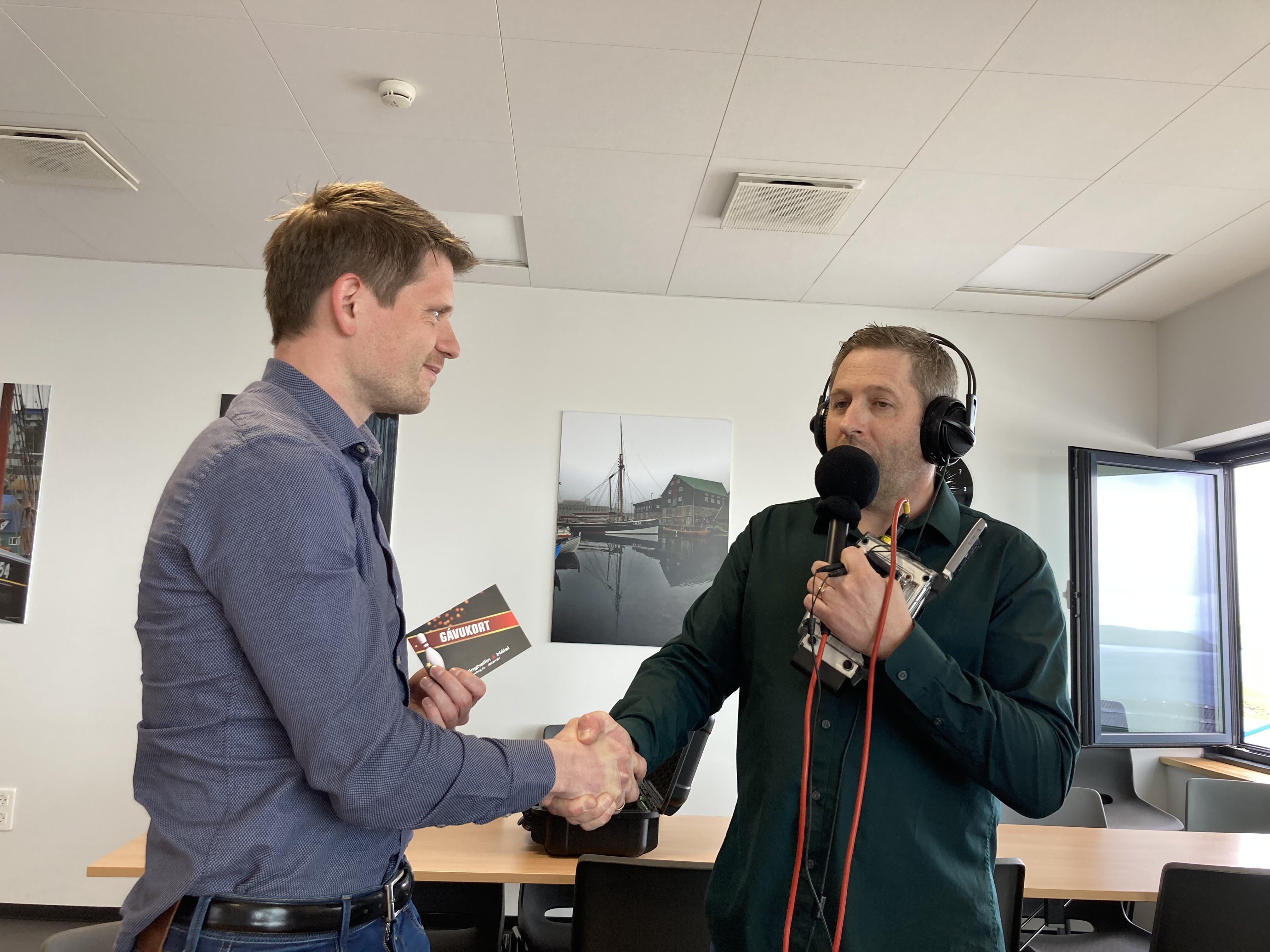 Petur Zachariassen handaði vinningarnar til liðskiparan hjá Bygma Balslev, Niels Kristian Lisberg og Óli Jákup Jacobsen frá SPEKT.