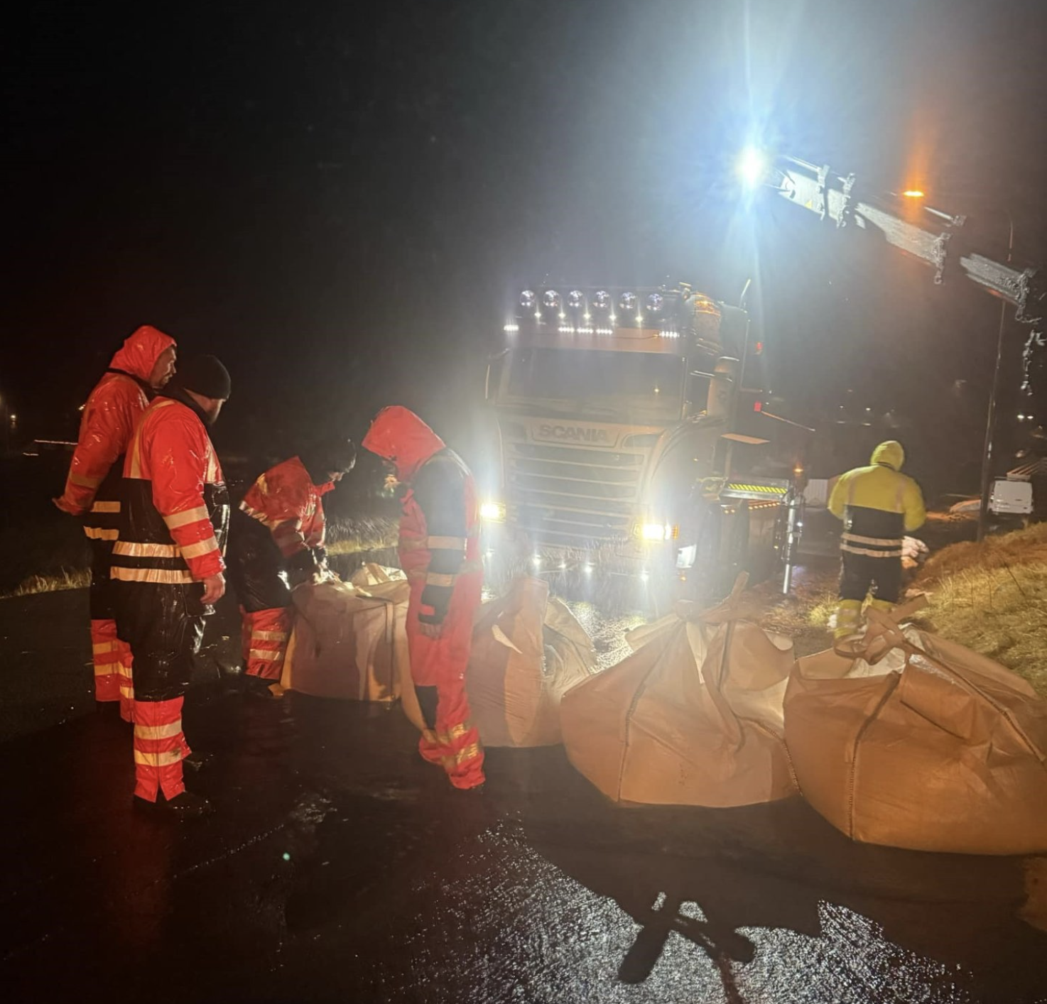 Orsakað av nógvum vatni eftir Vørðuvegi í Hósvík hevur sløkkiliðið staðsett sekkir fyri at leiða vatnið burtur av vegnum.