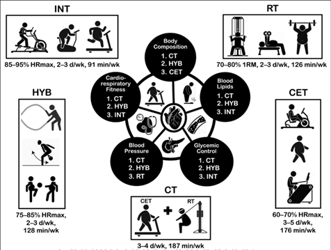 Myndin vísir tey venjingarsløg, sum eru kannað. INT; intervalvenjing, RT; styrkisvenjing, CET; treystisvenjing, CT; samansett-venjing; HYB; hybridvenjing. Samsett venjing er munadyggast, og hybridvenjing er næstbest fyri at betra hjarta-lungu-venjingarstøðu, kropssamanseting, blóðtrýst, blóðsukurtamarhald og kolesterol/feitt í blóðinum