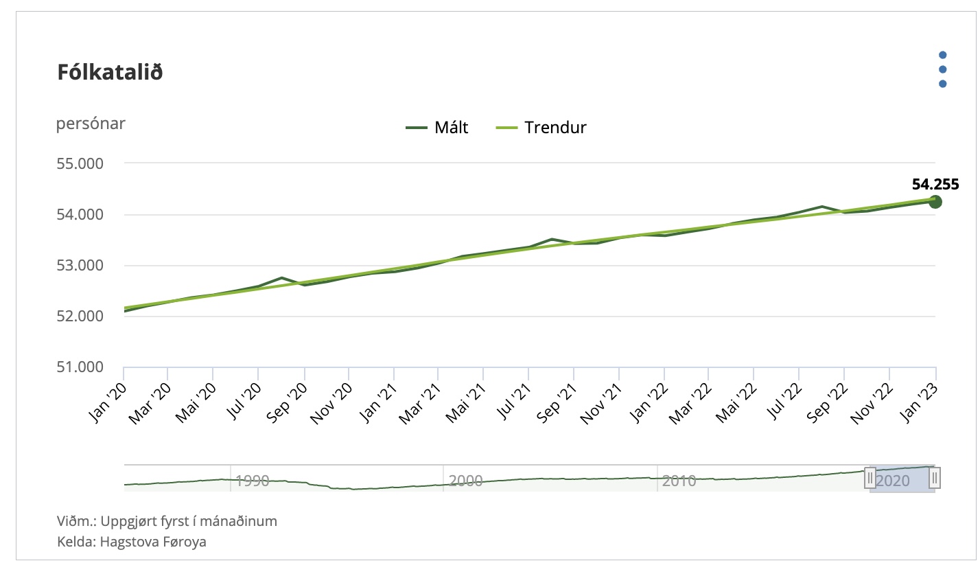 Tað skrivar Hagstovan. Fólkavøksturin í Føroyum heldur fram á níggjunda ári. Seinasta árið hevur hann verið lakari enn undanfarnu árini, og tað kemur serliga av stóru minkingini í burðaravlopinum. Hinvegin vigar ein vøkstur í nettoflytingini í stóran mun upp ímóti hesum, so samanumtikið vísir trendurin í myndini niðanfyri framhaldandi vøkstur í fólkatalinum.