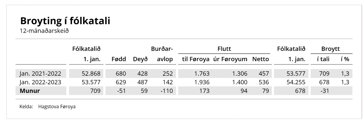 Tað svarar til ein árligan fólkavøkstur á 1,3% - tað sama sum í 2021. Samanborið við 2021 fyllir nettoflytingin meiri og burðaravlopið minni.