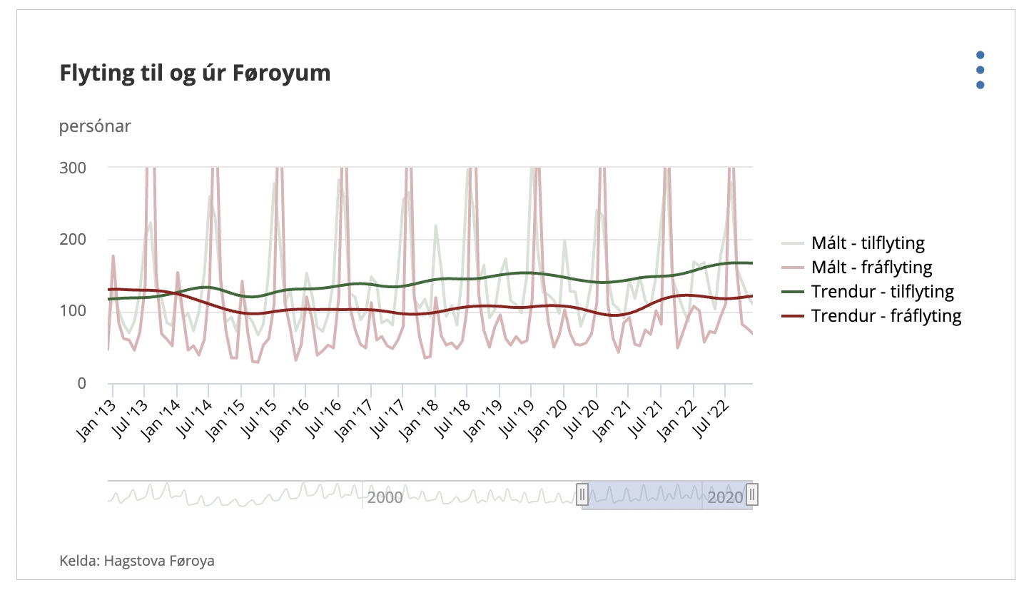 Myndin niðanfyri lýsir gongdina í til- og fráflytingini. Trendurin vísir, at bæði til- og fráflytingin minkaðu í 2020. Hetta vardi tó ikki leingi, og við ársenda í 2020 kom gongd aftur á flytingarnar. Fráflytingin vaks lutfalsliga skjótt fram móti heysti í 2021, og síðani tá hevur hon ligið um 120 í miðal mánaðarliga. Tilflytingin hevur verið javnt vaksandi síðani síðst í 2020 og er vaksin nakað meiri enn fráflytingin. Nú flyta í miðal 165 fólk til Føroya mánaðarliga.