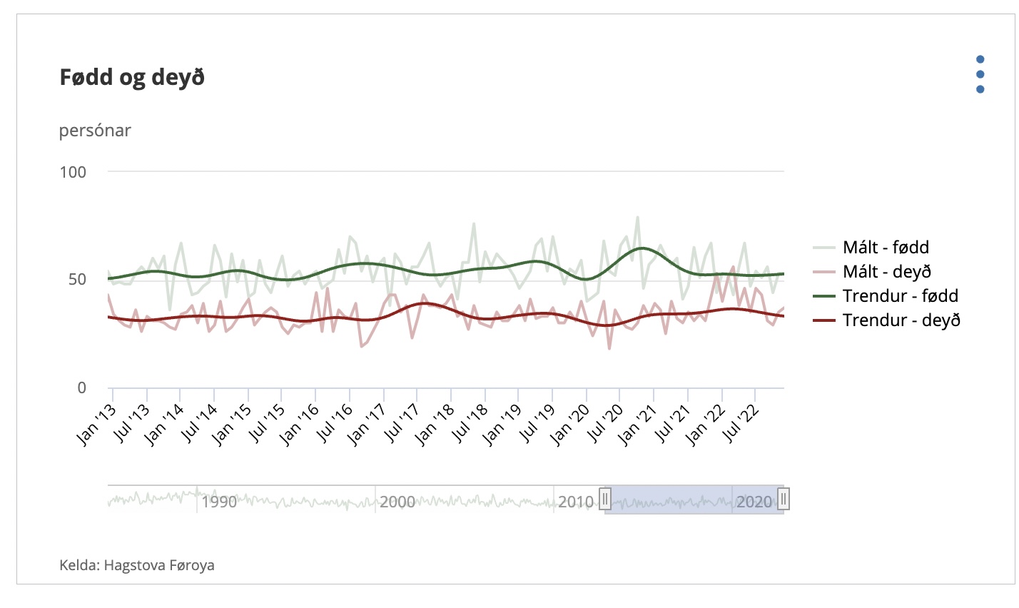 Trendurin í myndini niðanfyri lýsir gongdina í føði- og deyðatalinum. Trendurin vísir, at høga deyðatalið í fyrru helvt av 2022 er minkað niður aftur á undanfarna stig, og nú doyggja millum 30 og 35 í miðal mánaðarliga. Gongdin í føðitalinum hevur verið støðug í útivið hálvtannað ár, og nú verða millum 50-55 børn fødd í miðal mánaðarliga.