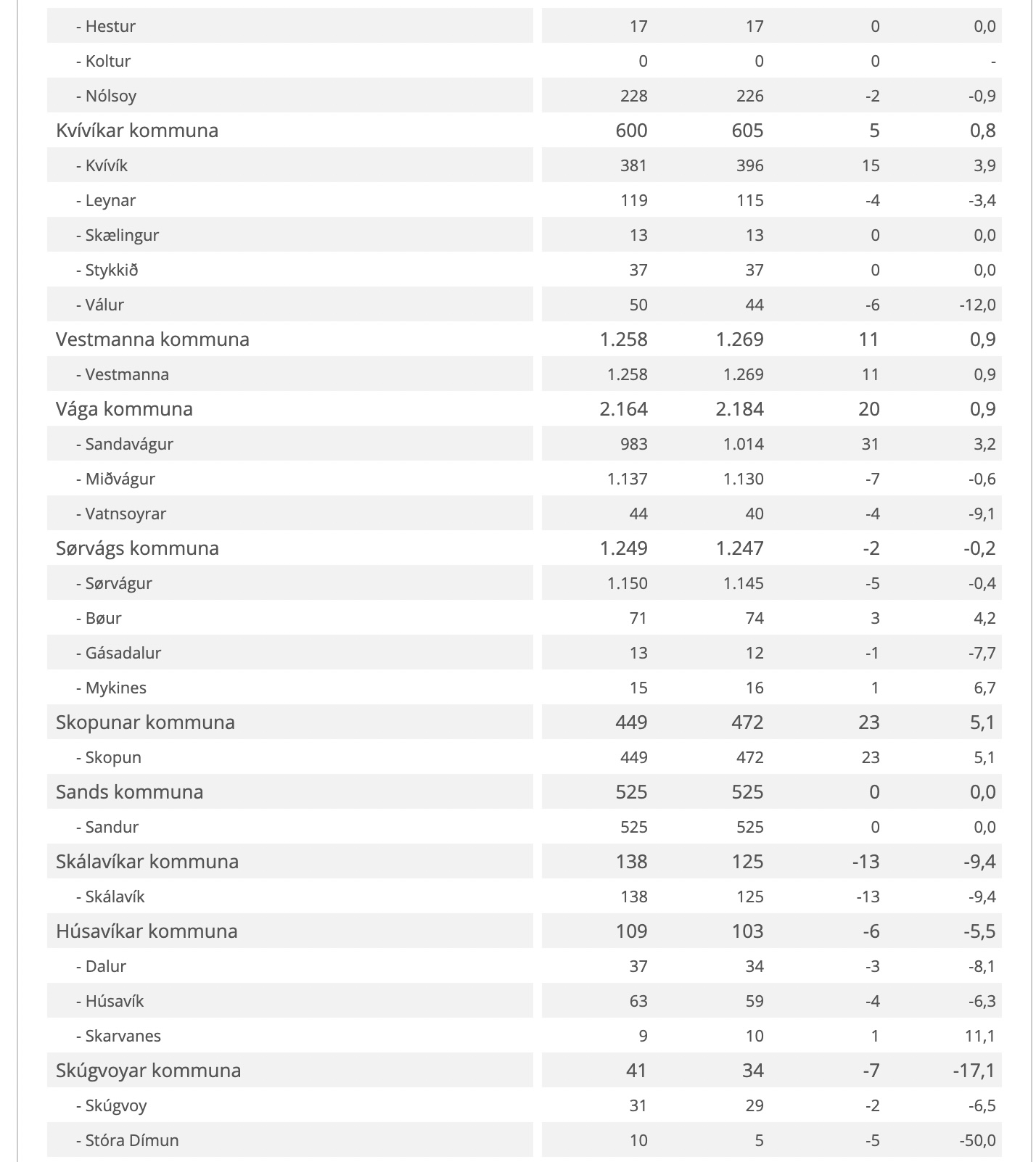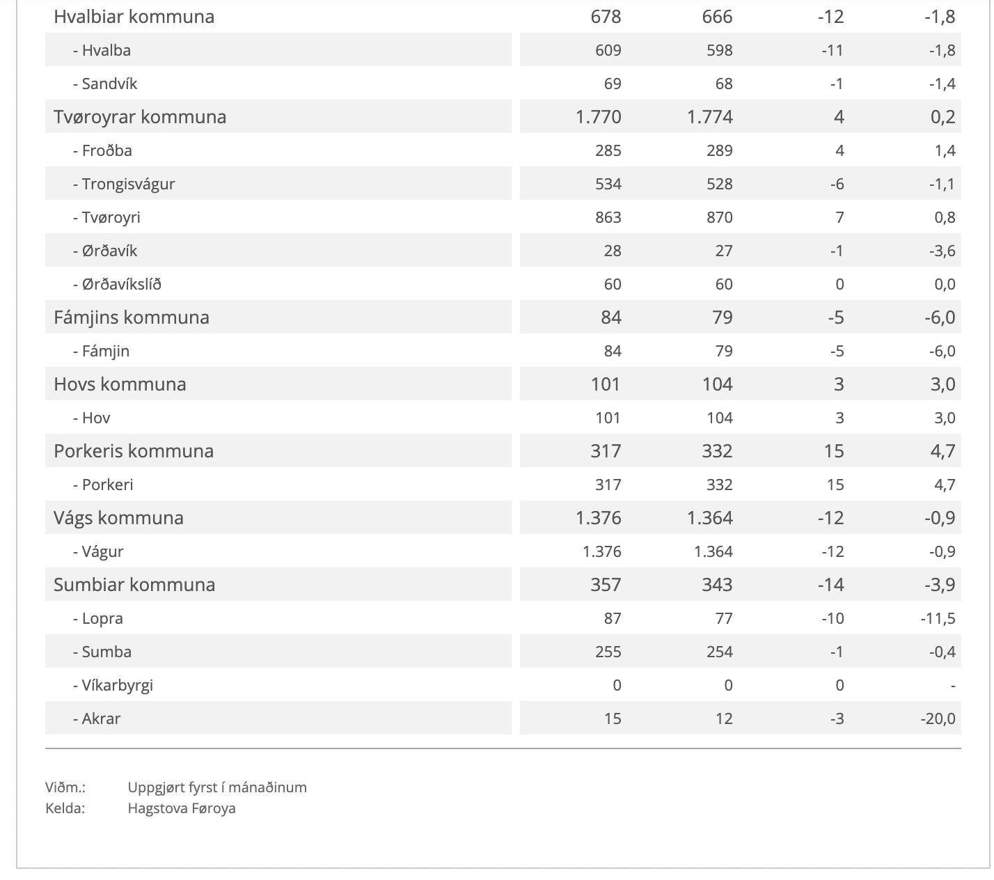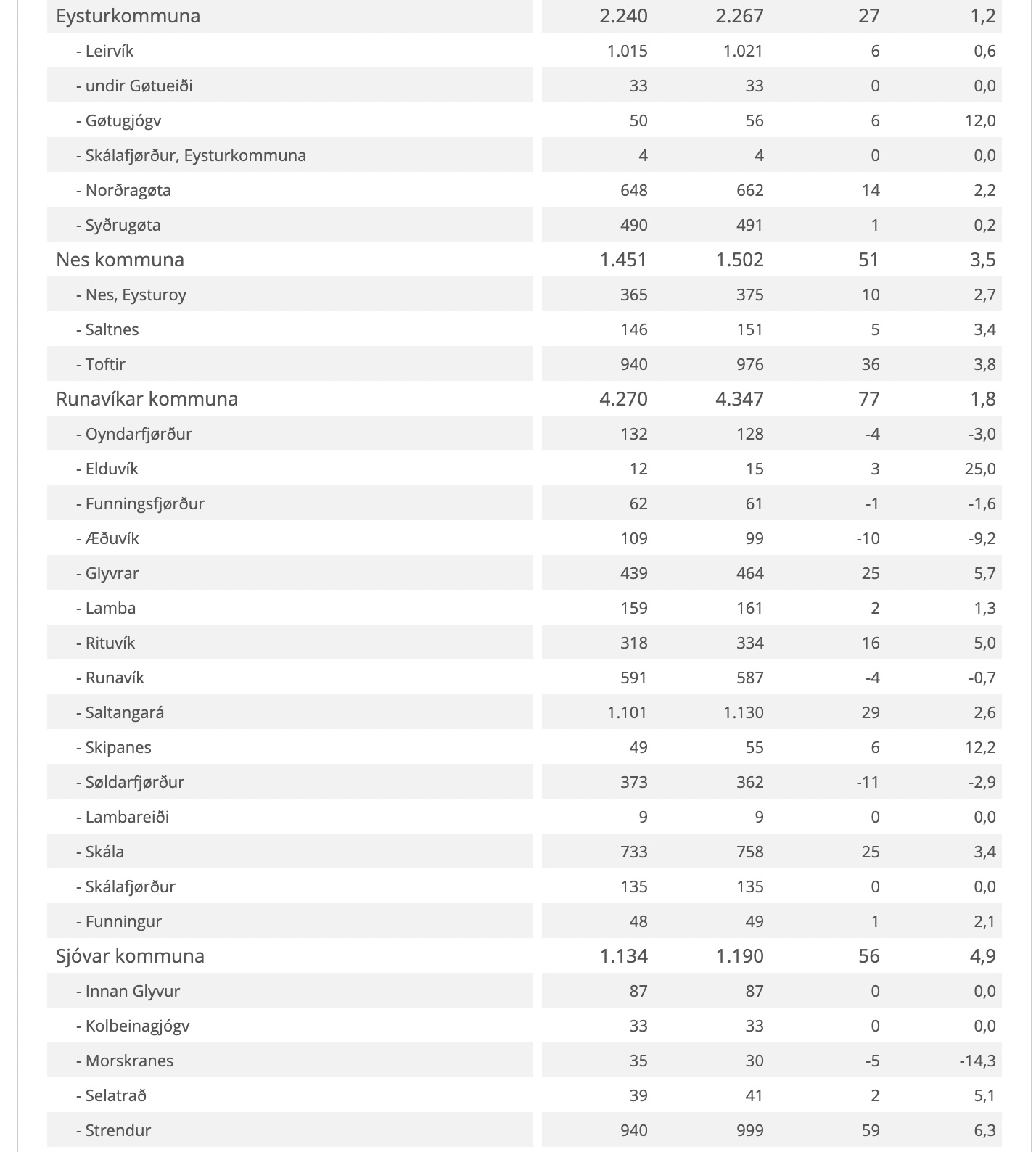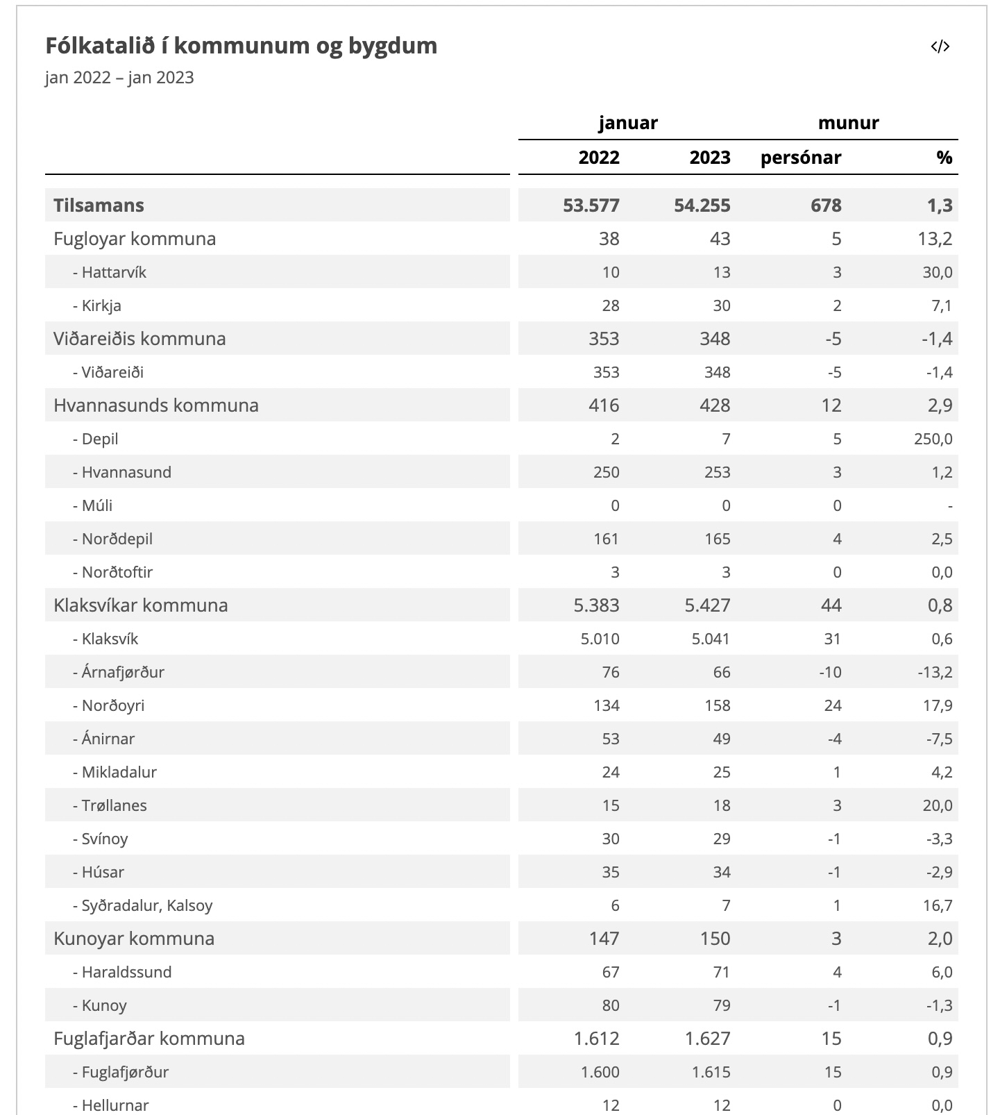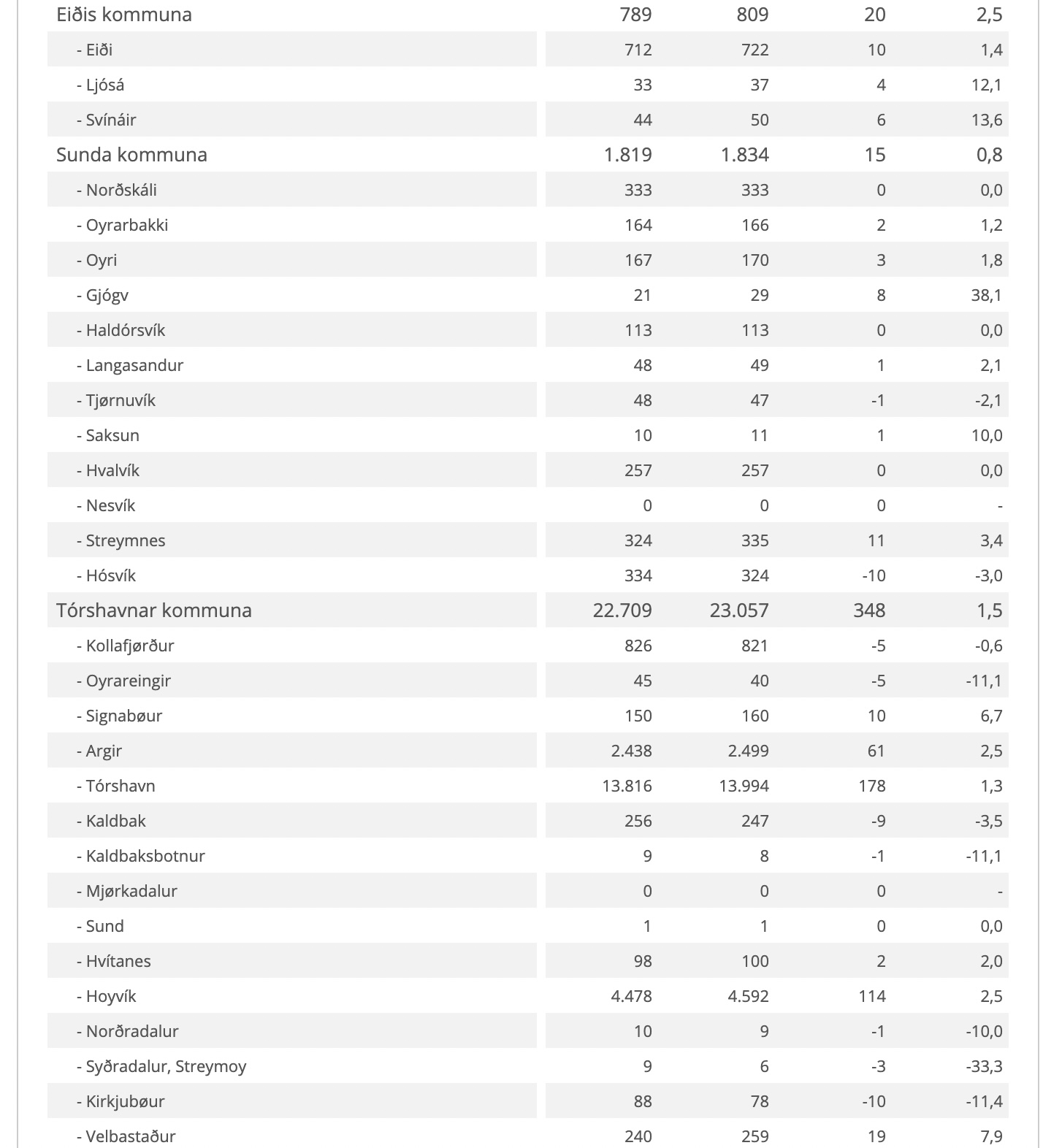 Talvan niðanfyri vísir fólkatalið í kommununum við tilhoyrandi bygdum 1. januar 2022 og 2023.