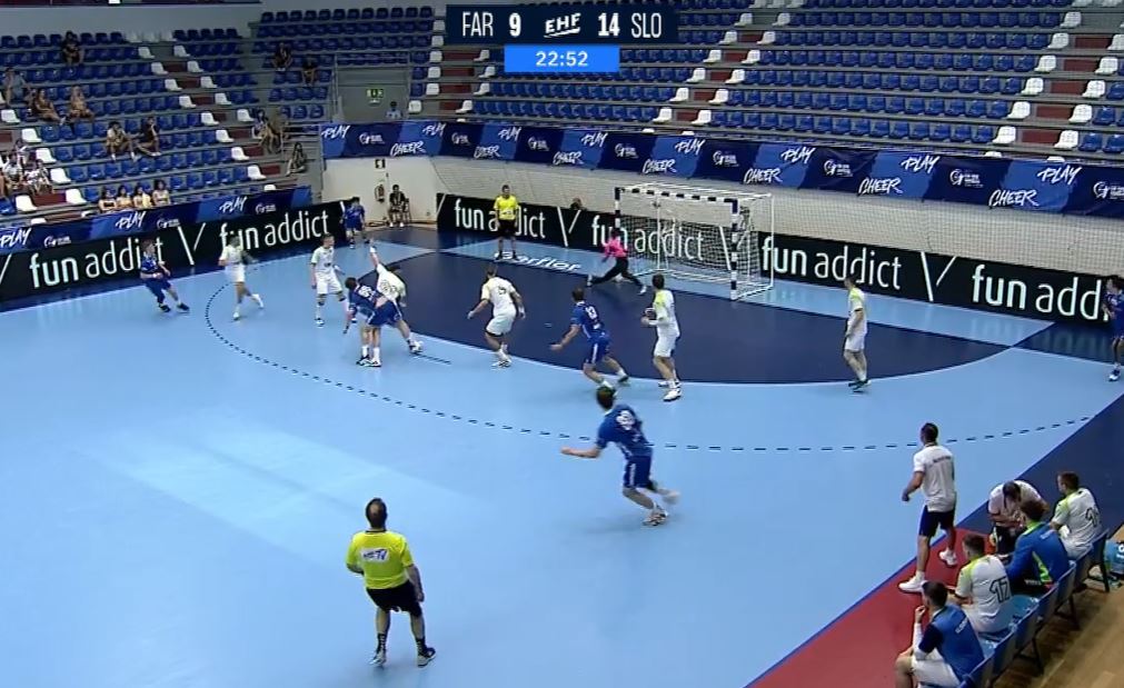 Tað er hálvleikur suðuri í Porto í Portugal, har Føroyar og Slovenia spæla EM dyst. Hálvleiksstøðan er 18-15 til Slovenia. Í gjár, tá ið Føroyar vunnu 33-32 ímóti Danmark, var hálvleiksstøðan 15-15.