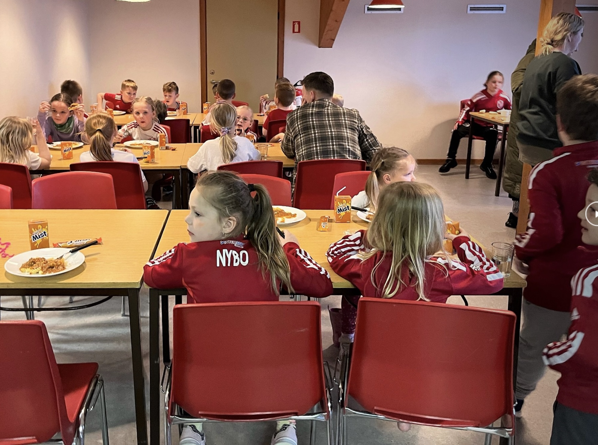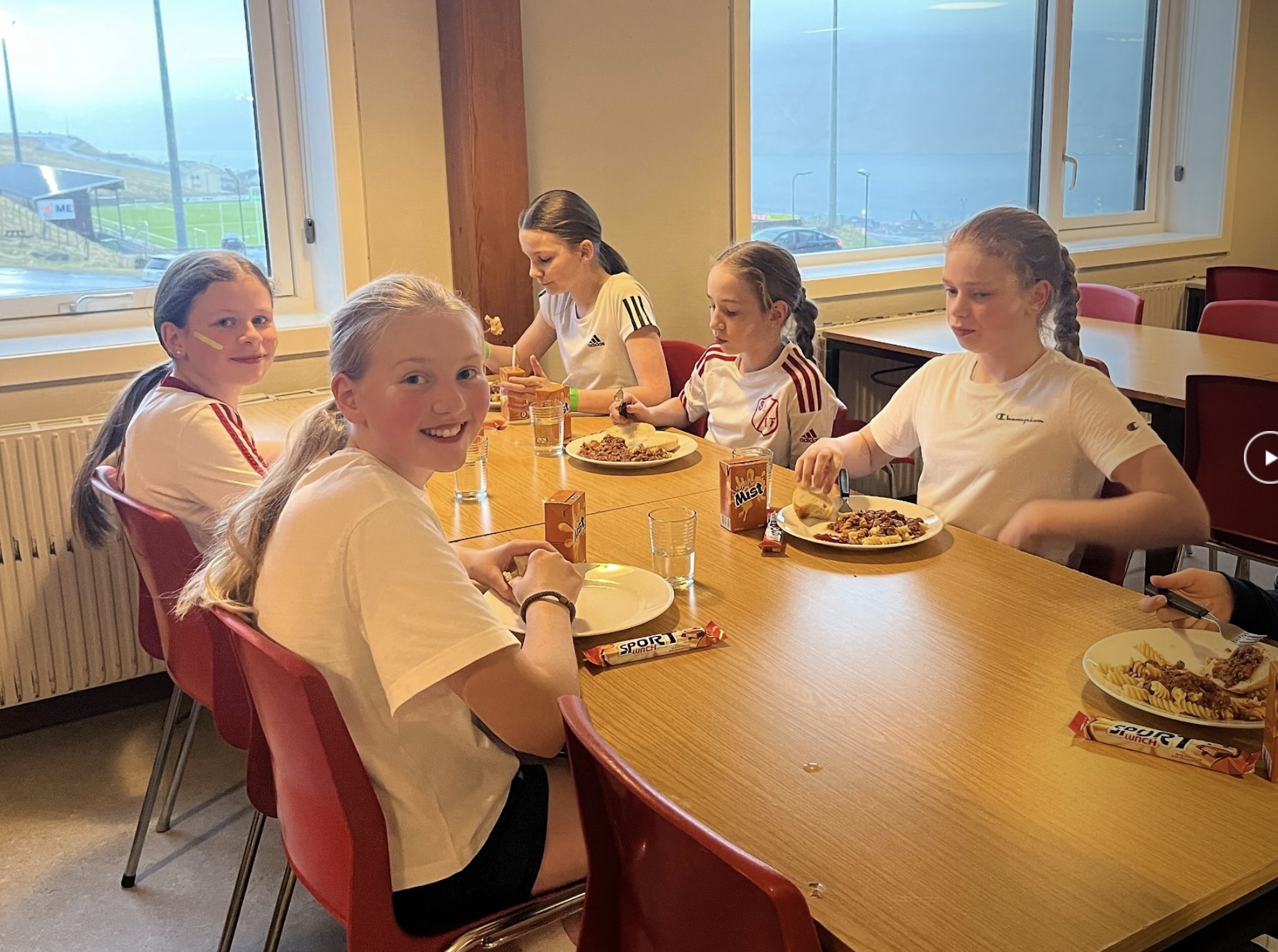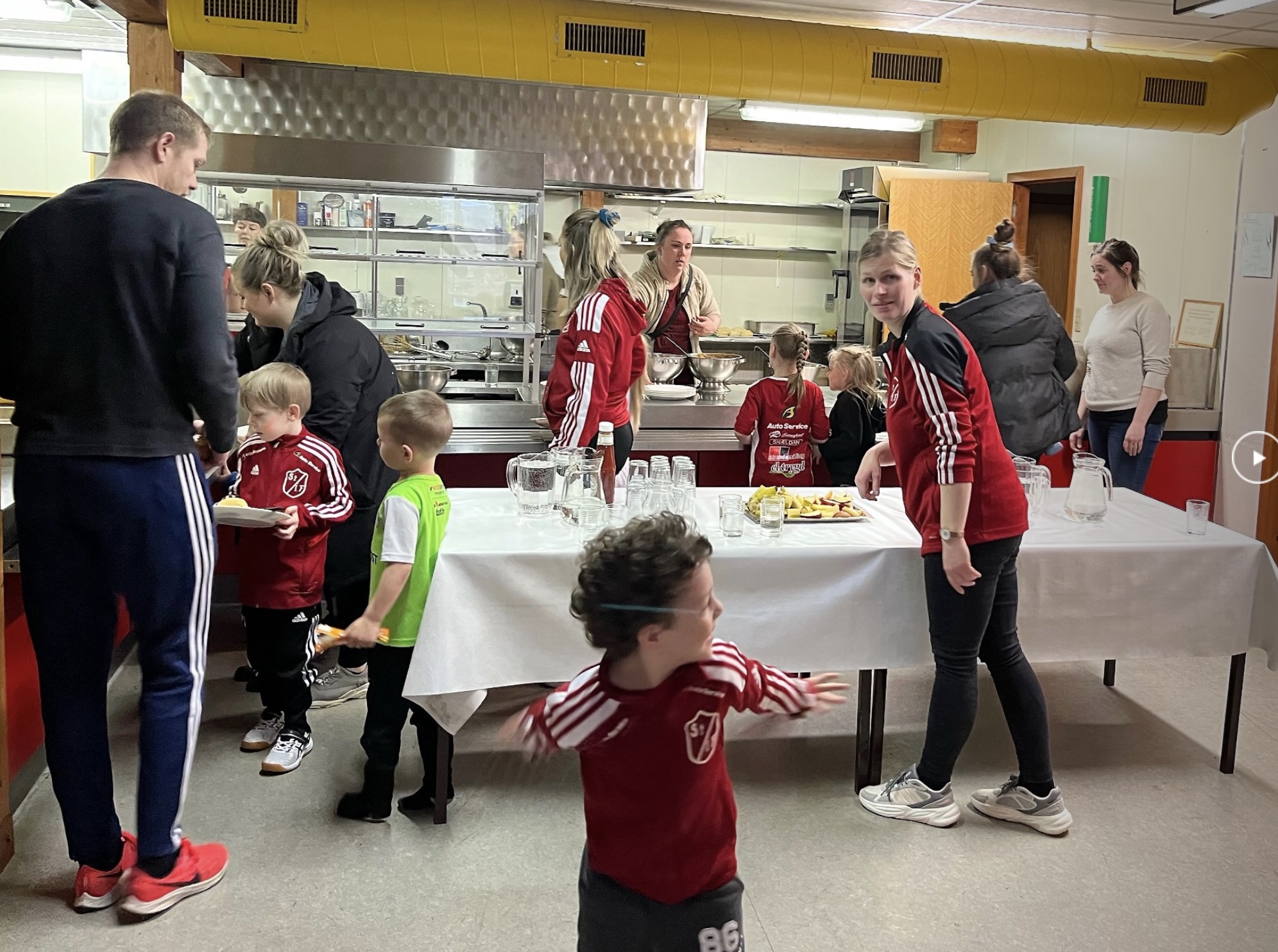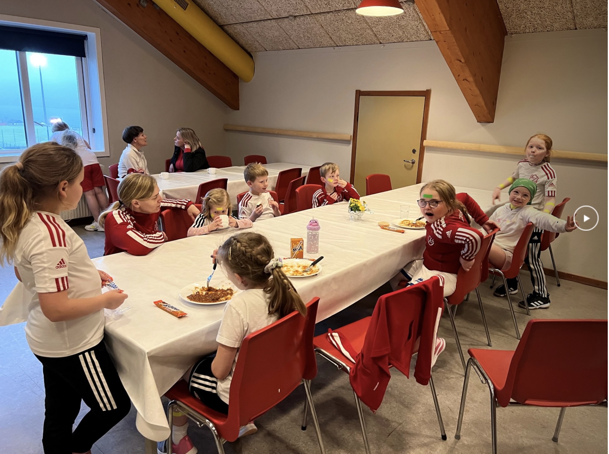 Aldursbólkarnir fingu døgurða í kaféteriuni, tá tey vóru liðug at spæla. Foreldrini í ymisku árgangunum skipaðu hetta sera væl og ruddaðu og vaskaðu upp eftir hvønn árgang.