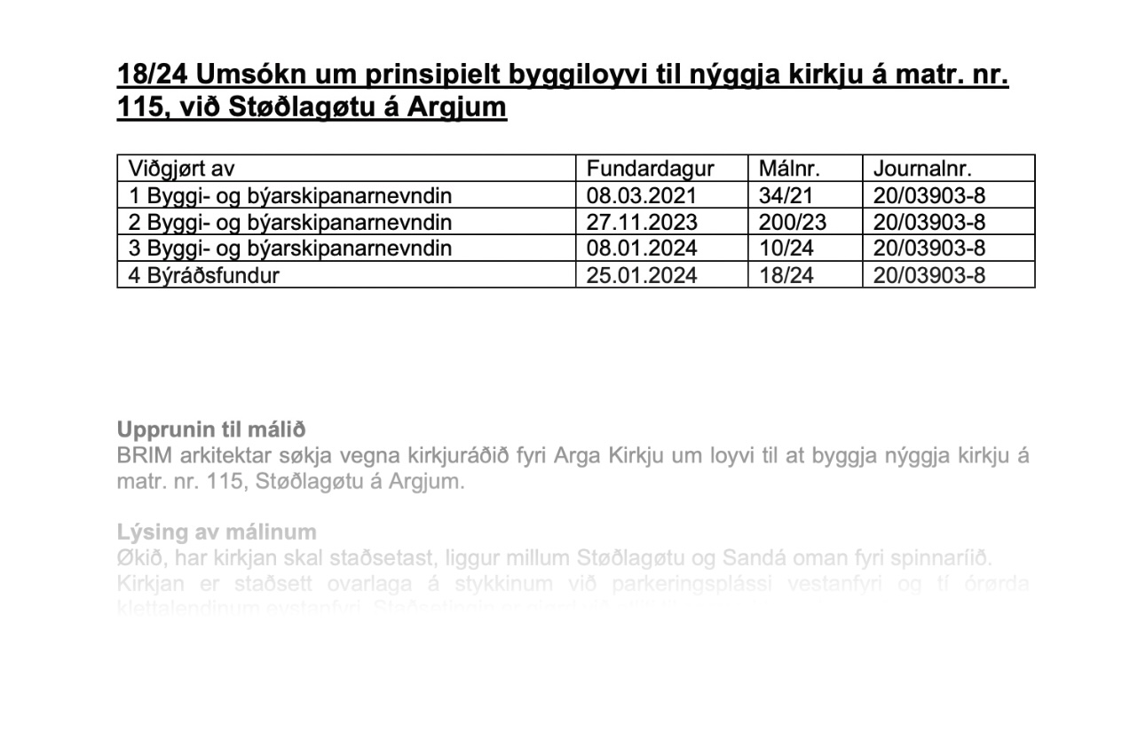 Nógv rumbul hevur verið um nýggju kirkjuna á Argjum. Málið hevur verið ígjøgnum alla skipanina hjá býráðnum, og tað er góðtikið av friðingarnenvd. Kirkjuráðið hevur fingið prinsippielt byggiloyvi frá býráðnum, nú vantar bara at byggiloyvið verður skrivað út. Men stígur tykist vera komin í, nú málið hevur møtt so stórari mótstøðu. Málið var fyri á býráðsfundi í Havn hóskvøldið, men tað varð beint aftur í byggi- og býarskipanarnevndini, sum nú skal taka støðu í málinum.