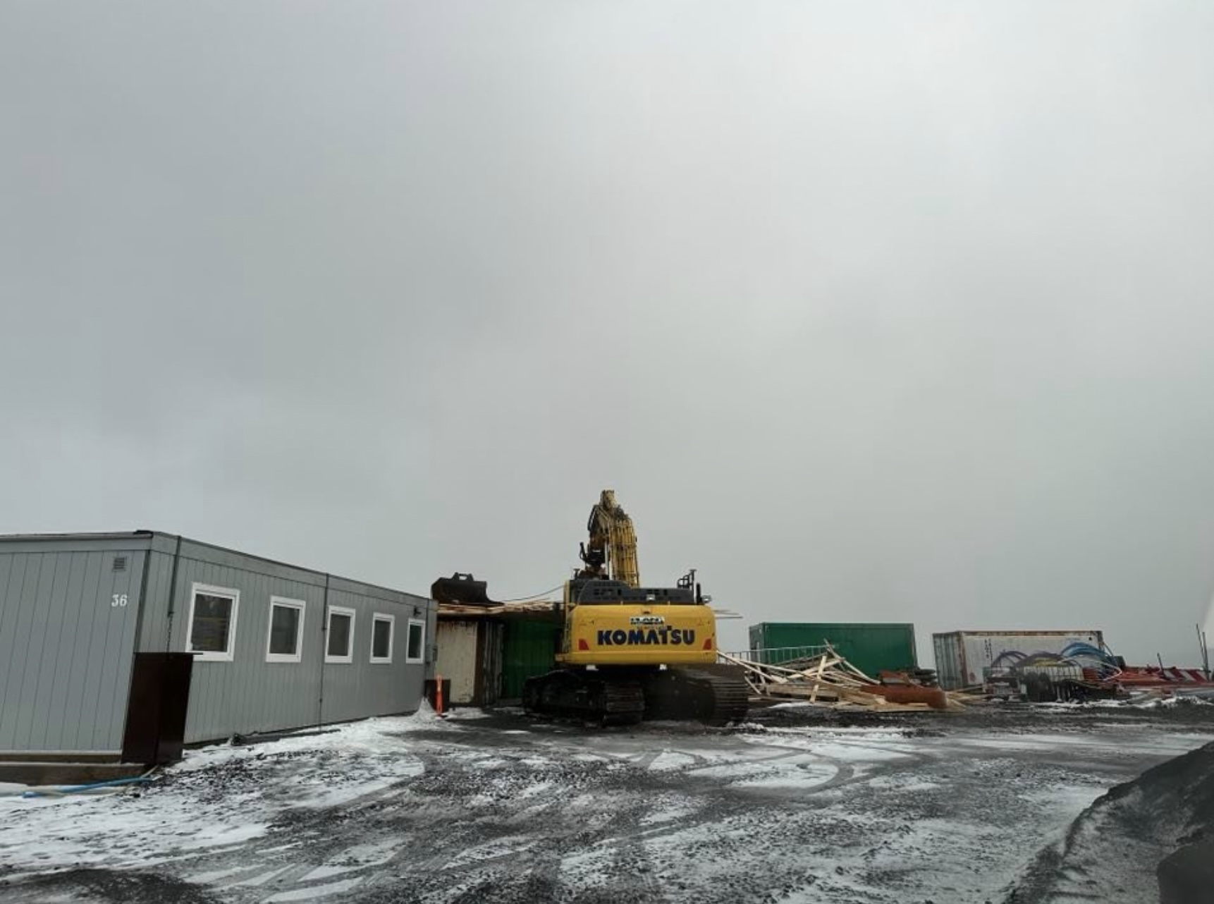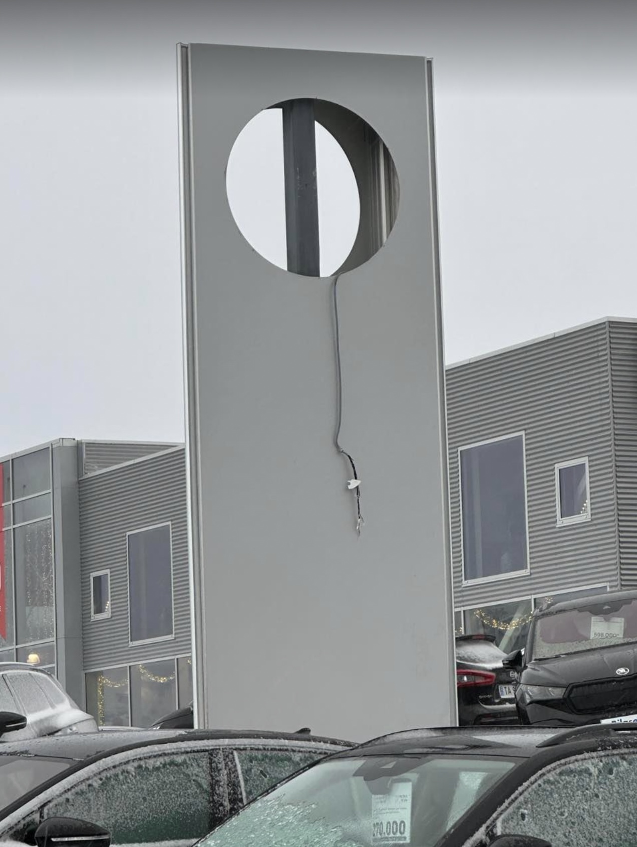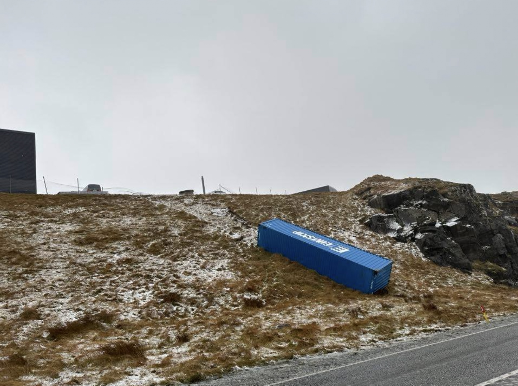 Myndirnar niðanfyri sína skaða á eitt stjórt skelti, hjá einin bilasølu á Vegnum Langa í Hoyvík. Á Sandvíkarhjalla er ein bingja tikin av vindi, og ein skúrur á einum arbeiðsøki er eisini farin í luftina.