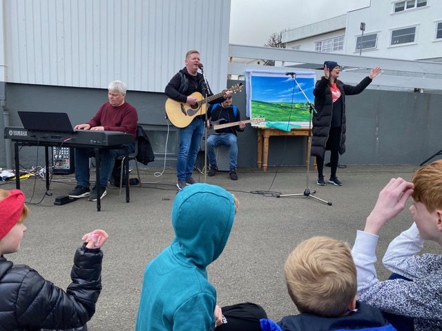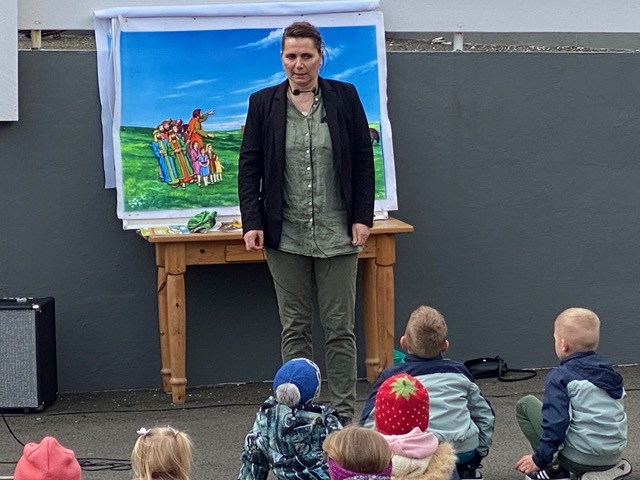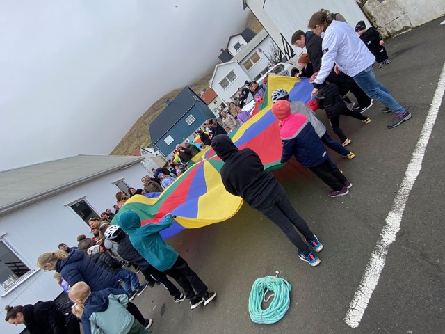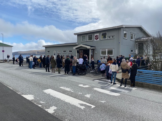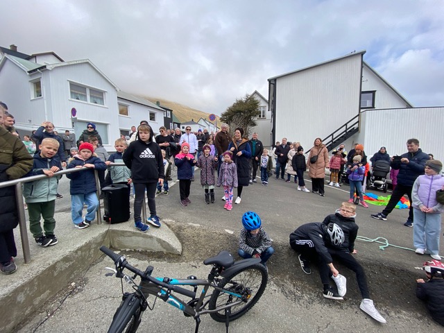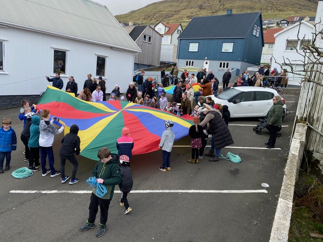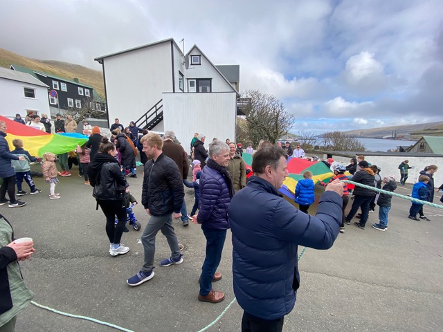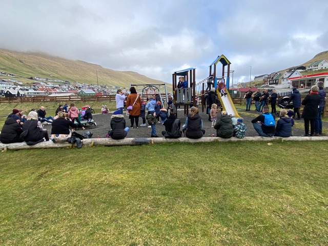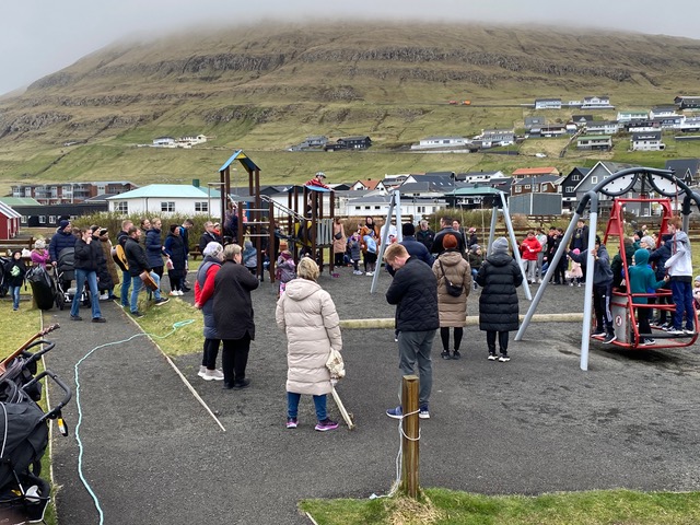 Eftir at endað varð við Faðir Vár, fór fjøldin vestur til sonevndu Parkina við Sandin, har børnini fingu okkurt gott at sløkkja tostan við og okkurt søtt. Síðani hugnaðu fólk sær við sangi, spølum og práti, innan øll fóru hvør til sítt, eftir eina góða løtu hjá børnum og vaksnum í góðveðrinum í dag.