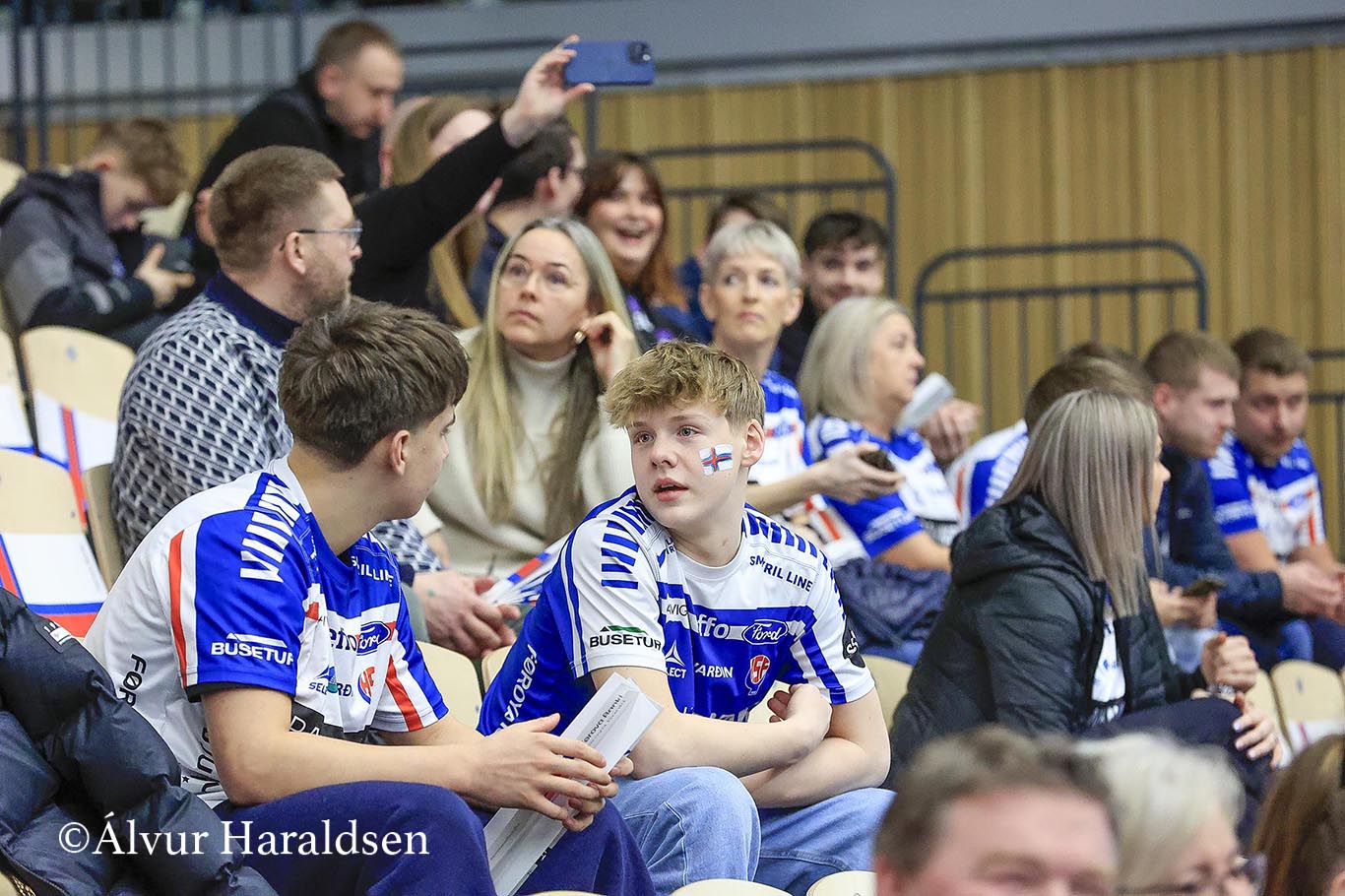 Tað eru fleiri enn 3000 áskoðarar í høllini, og nú syngja teir tjóðsangin.