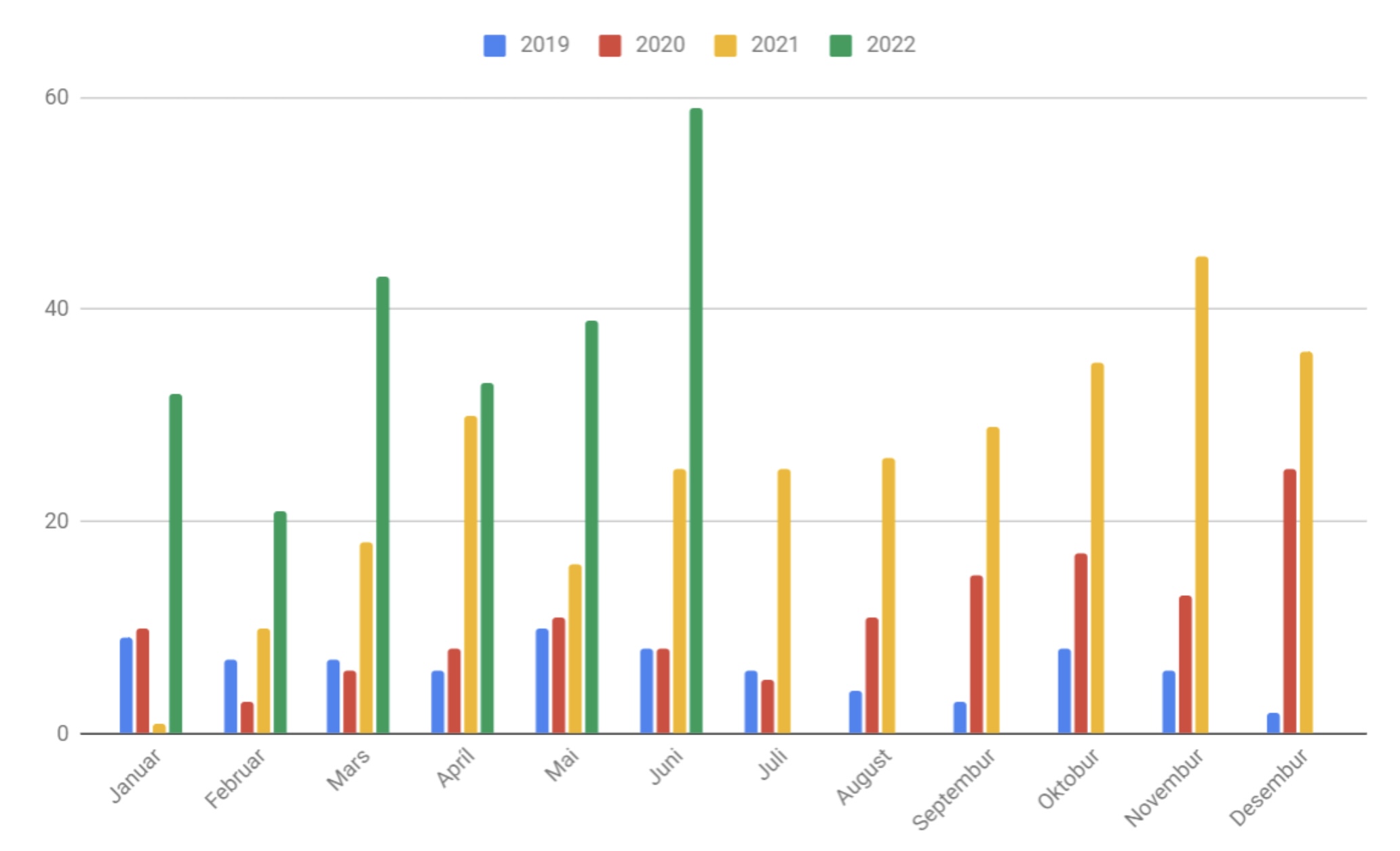 Framgongdin í nýskrásetingum av elbilum í Føroyum seinastu 3,5 árini, sæst á stabbamyndini niðanfyri:
