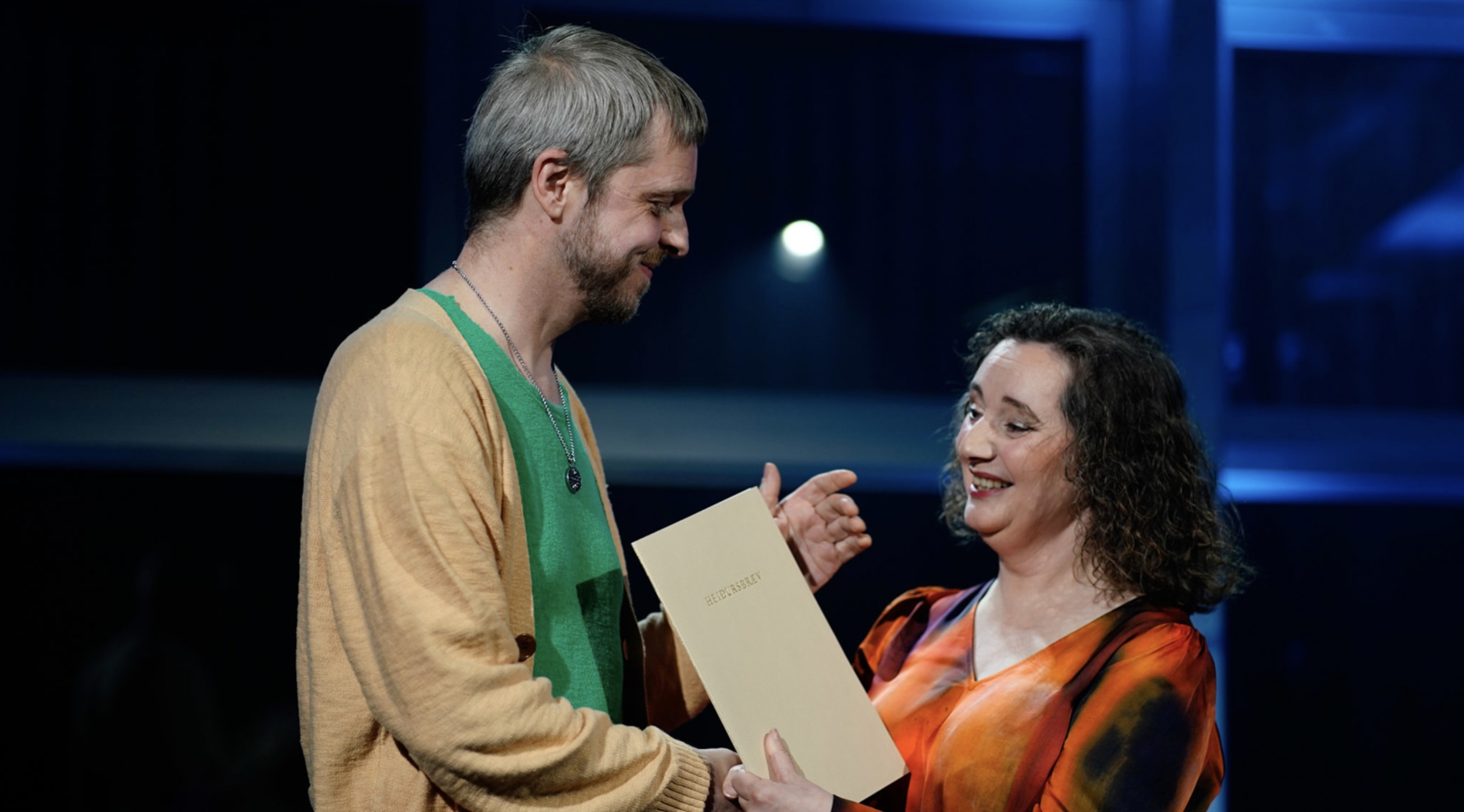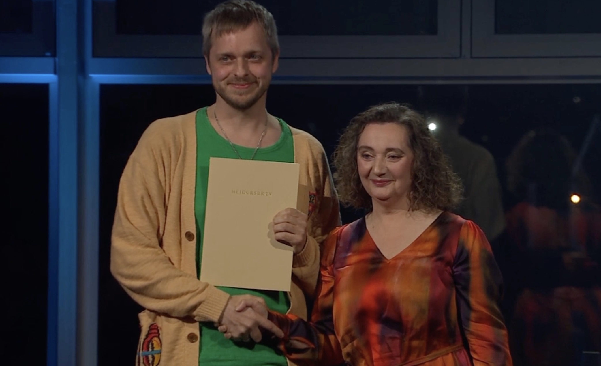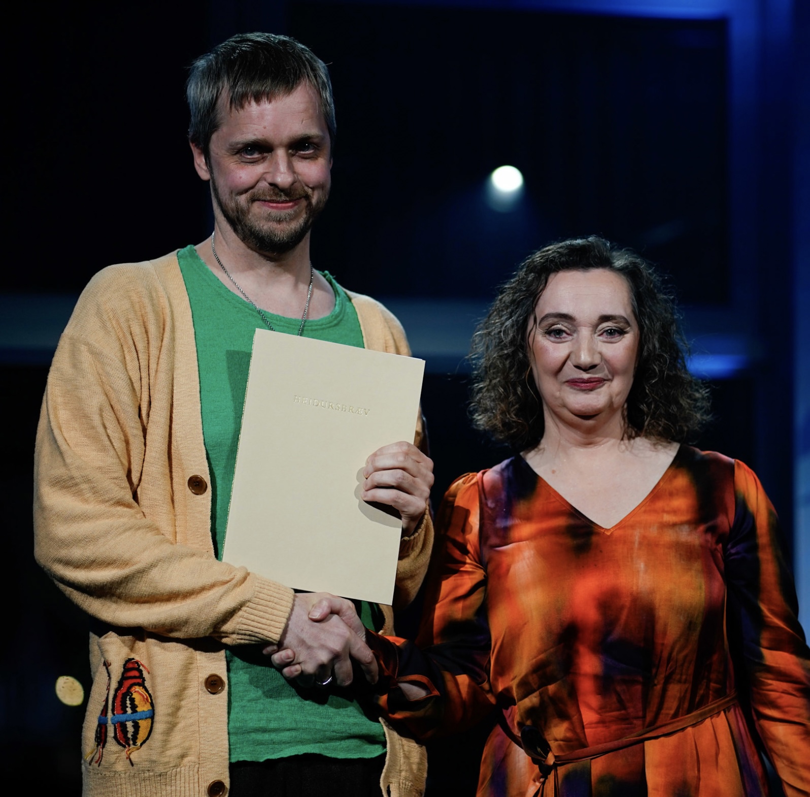 Sirið Stenberg, landsstýriskvinna í almanna- og mentamálum, hevur handað Teiti Lassen, tónlistamanni, Mentanarvirðisløn landsins fyri avrik síni.