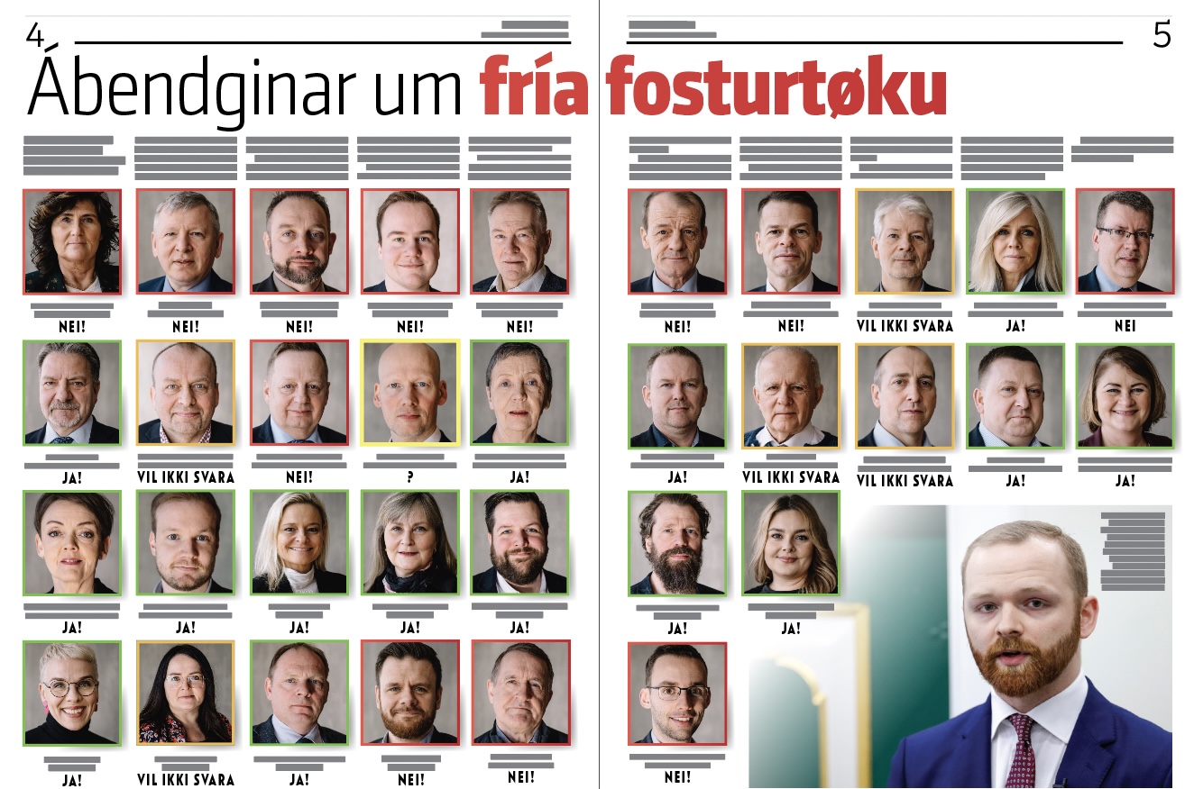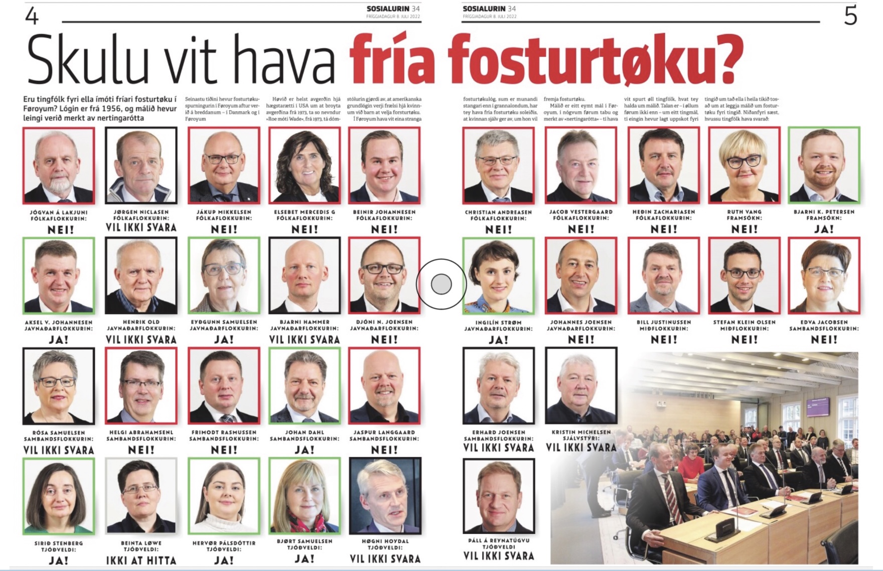 Fyri fyrstu ferð kann staðfestast, at størsti parturin av tingfólkunum eru fyri, at kvinnan sjálv skal ráða, tá tað snýr seg um fosturtøku. Málið hevur góðan møguleika at verða samtykt í Løgtinginum í vár