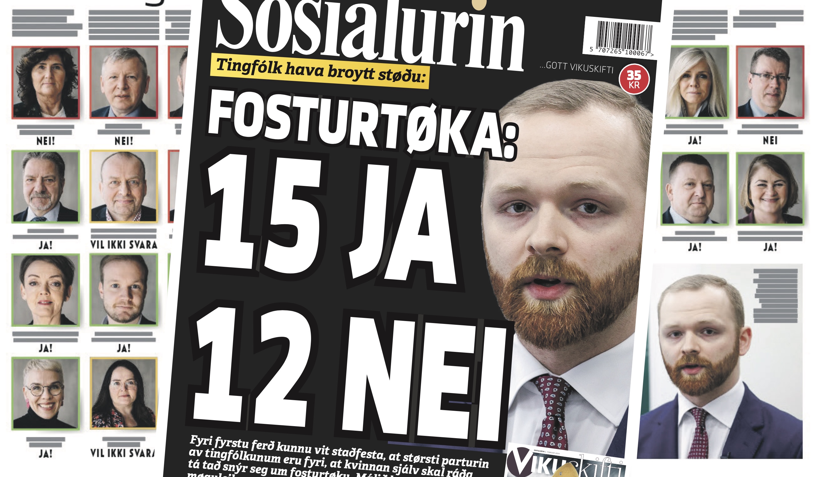 Tað vísir spurnarumfar, sum Sosialurin hevur gjørt millum tingfólk. 15 tingfólk siga, at tey fara at atkvøða fyri uppskotinum hjá Bjarna Kárason Petersen um at broyta fosturtøkulógina soleiðis, at fosturtøka kann loyvast til og við 12. viku. 12 tingfólk siga nei, men hini seks ikki vilja siga sína hugsan.