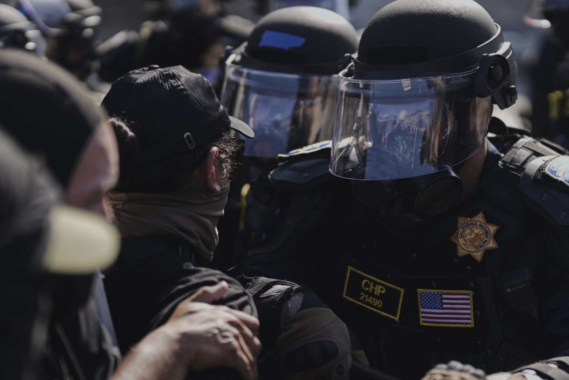 Samanbrestir vóru millum hermenn hjá tjóðarhirðini og mótmælisfólk í amerikanska býnum Los Angeles sunnudagin.