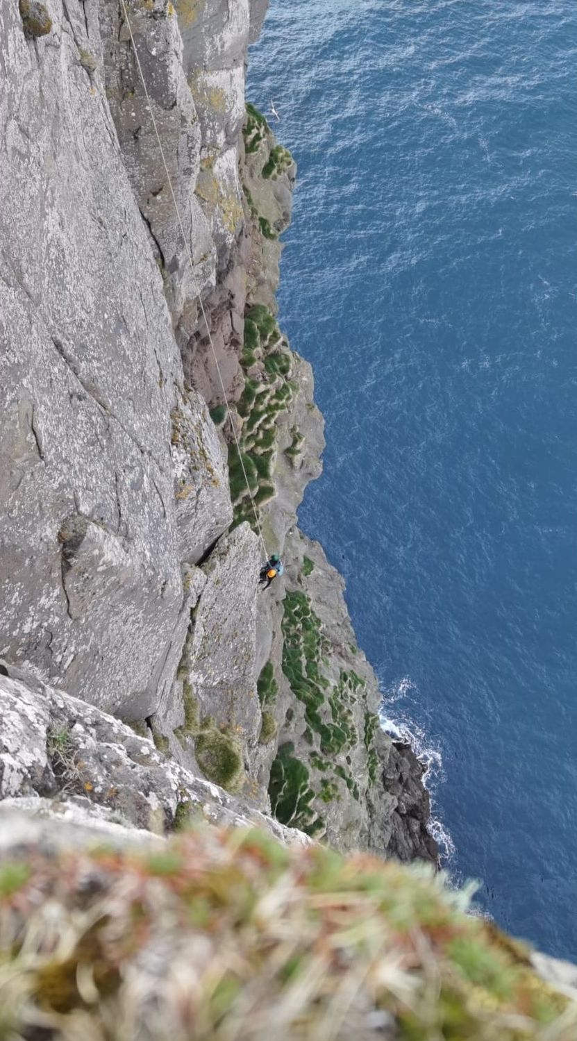 Tá sandoyingar eru eftir nátaeggum Yviri á Egg, verður farið niður á einar 30 til 80 metrar, og her verður traktorur brúktur til at hála menn - ella kvinnur - upp aftur úr berginum við, tí tað er so nógv lættari enn við handamegi.