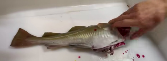 Í gjár legði hann út nakrar myndir - og eitt videobrot - av toski við sprænfullum maga. Forvitin, sum hann er, kryvur hann fiskin og hyggur í magan.
