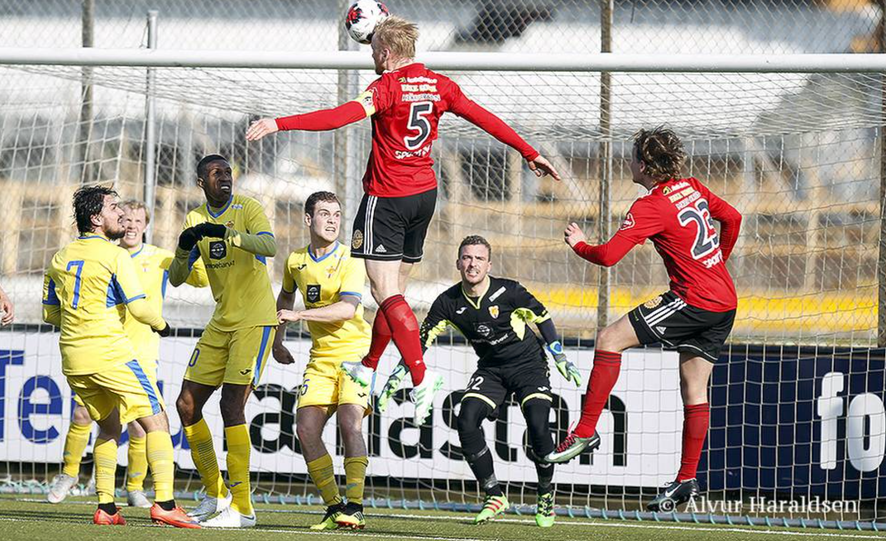 Jóannes K. Danielsen leggur innfyri úr høgru, og við nærra stólpa er Torben Grytten fremstur og fyrstur á bóltinum, sum hann við høvdinum sendir í málið.